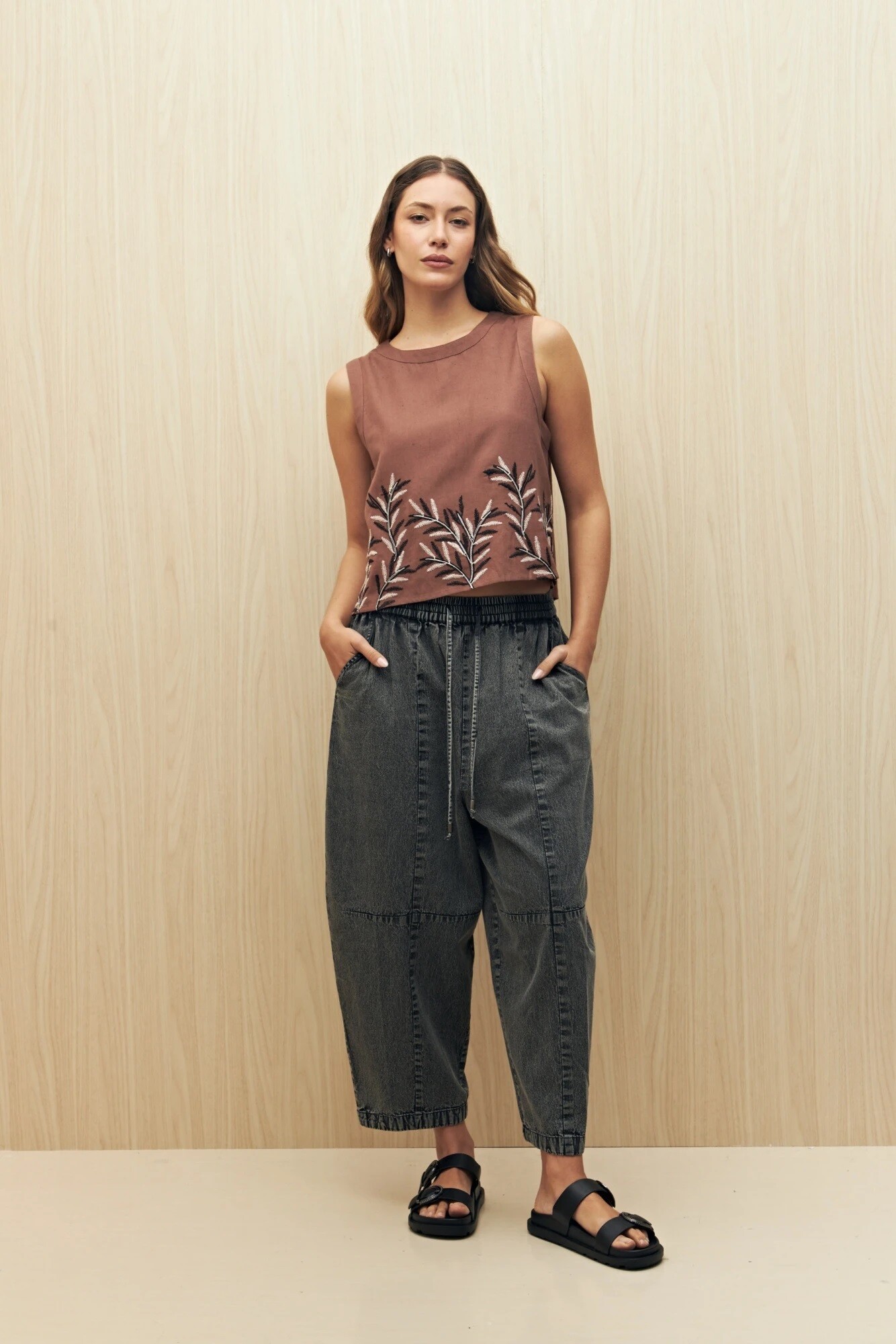 $ 1.352 Blusa de lino sin mangas cuello base y borados.