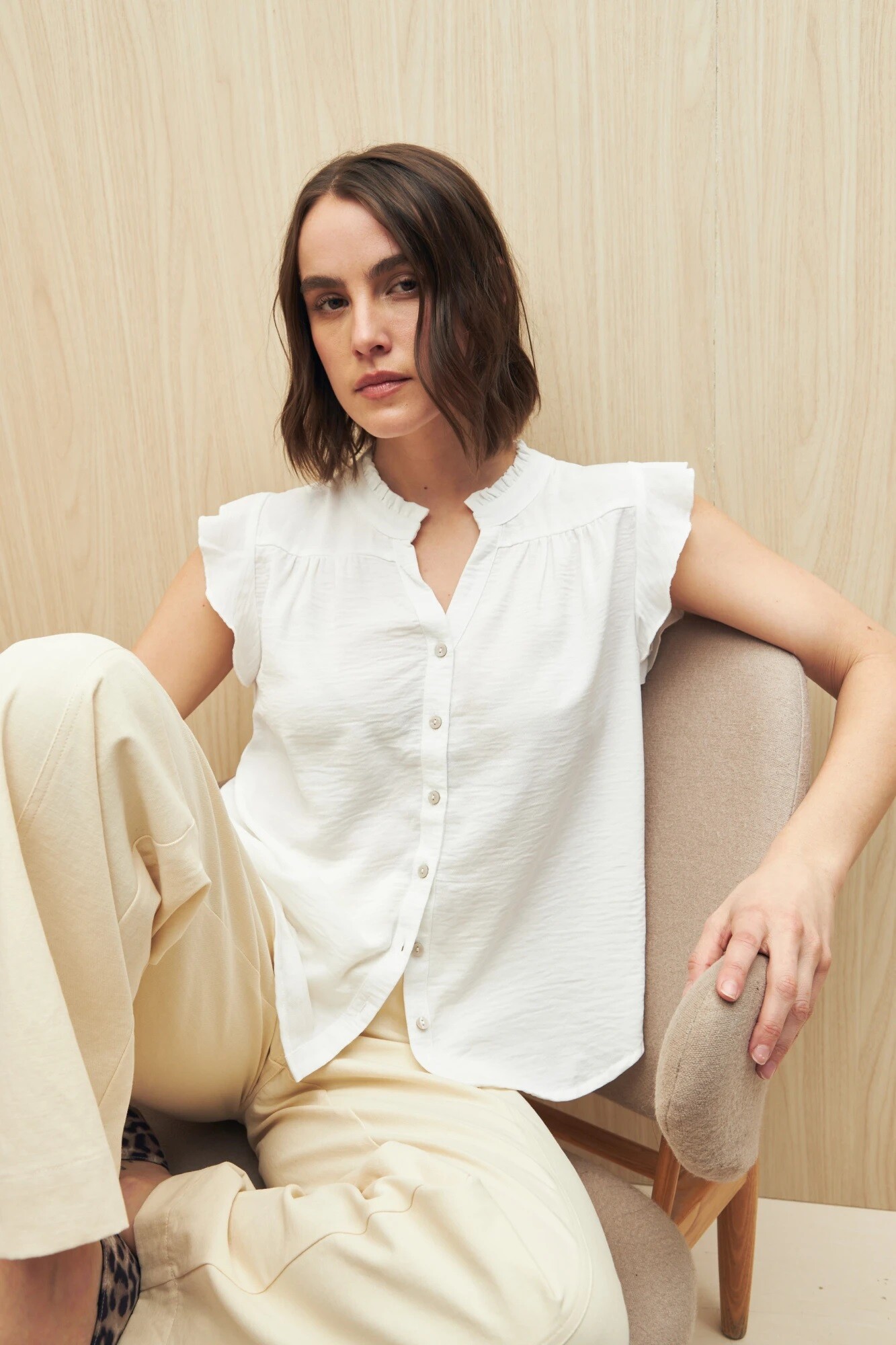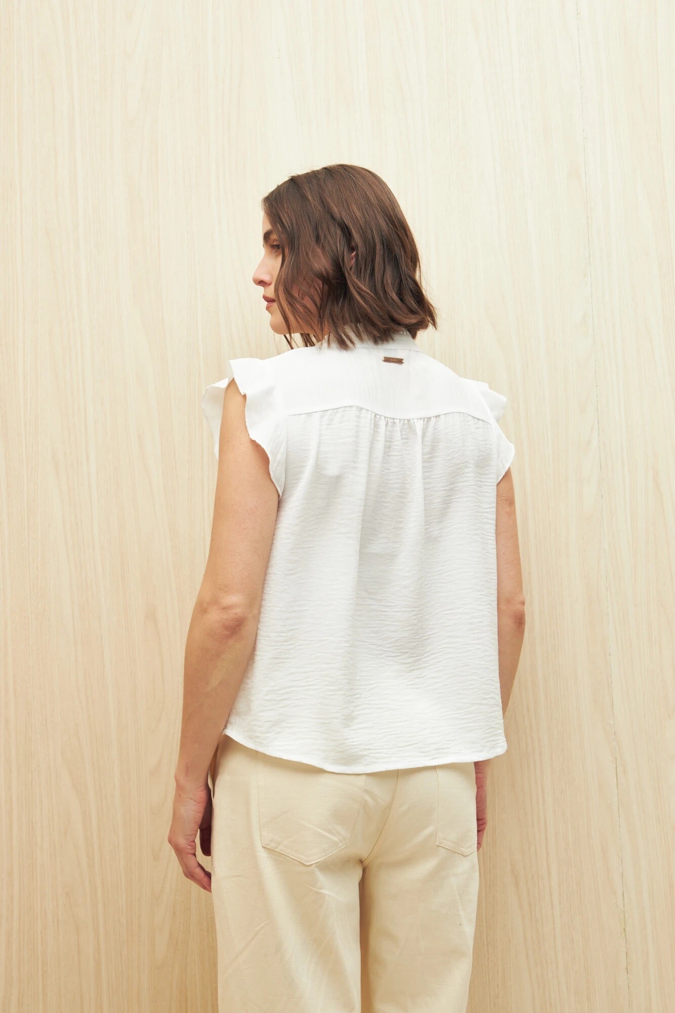 $ 792 Blusa liviana con cuello Mao y sutil volado que le aporta un toque femenino al clásico estilo office. Con caída suave y textura delicada, es ideal para llevar dentro del pantalón o falda y acompañar looks de trabajo con un aire actual y relajado.