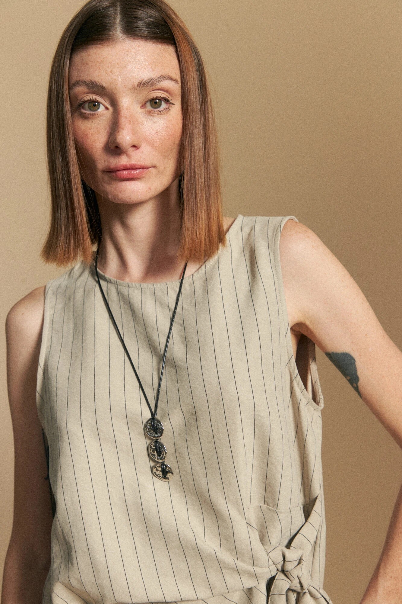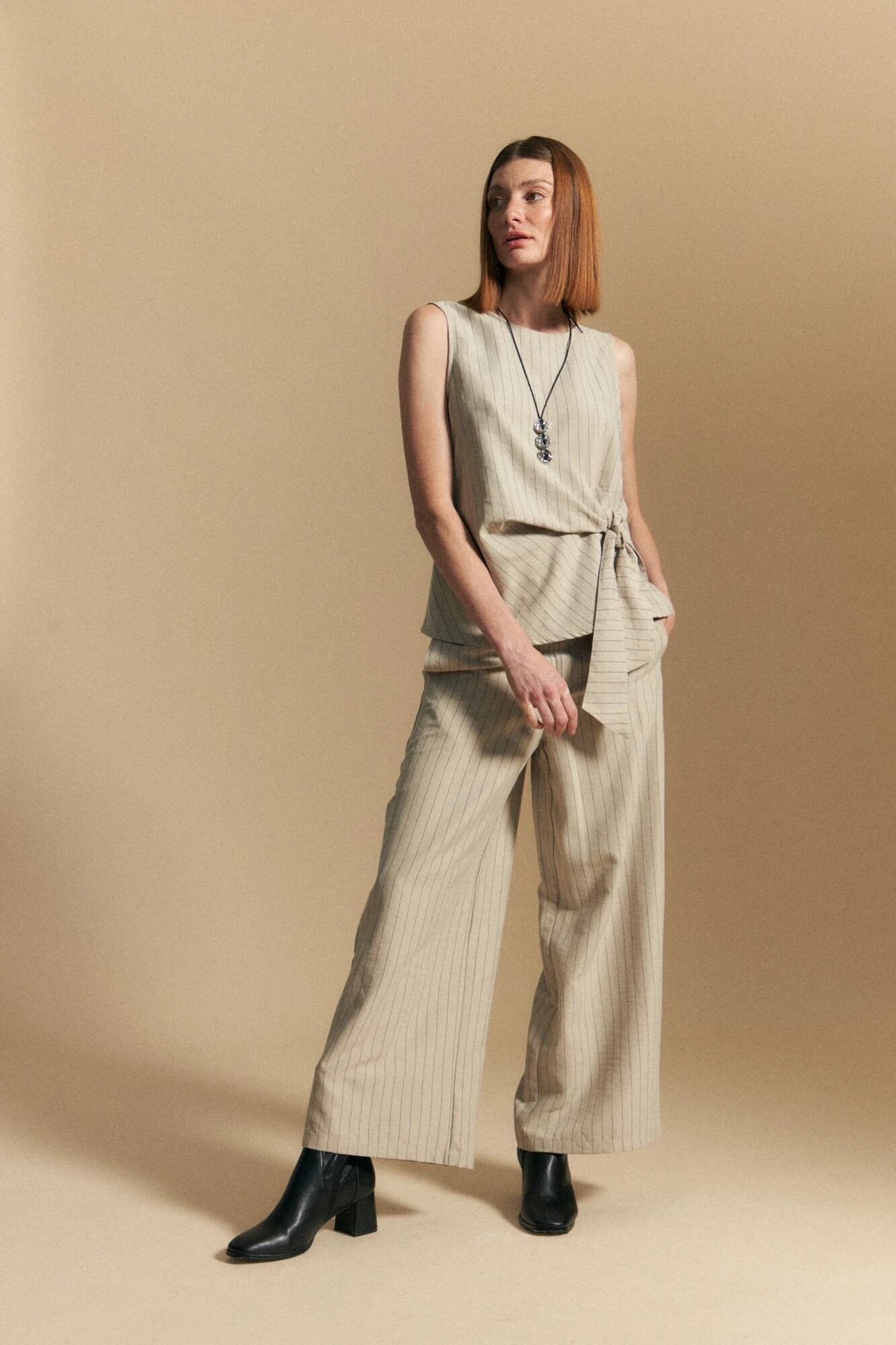 Blusa sin mangas de diseño a rayas finas, con silueta recta y detalle de lazada lateral que aporta movimiento y un toque diferencial al diseño. El escote cerrado equilibra la prenda, mientras que el cruce lateral permite un calce favorecedor y adaptable. Ideal para usar solo o como parte de un conjunto, es una pieza versátil que suma estilo sin esfuerzo.