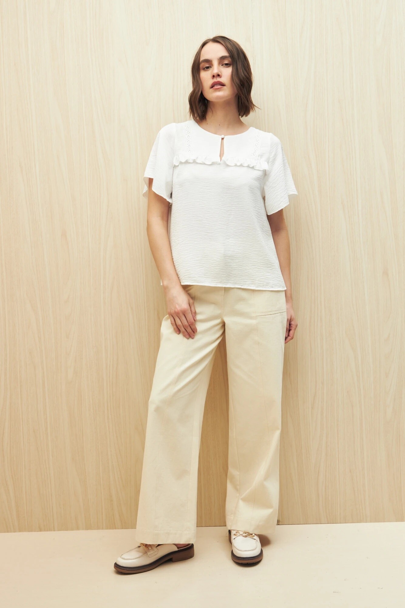 Blusa con textura sutil y un delicado detalle de encaje sobre el canesú, acompañado por un pequeño volado que realza el diseño. Su corte fluido y mangas amplias aportan movimiento y frescura, perfecta para looks femeninos y cómodos del día a día.