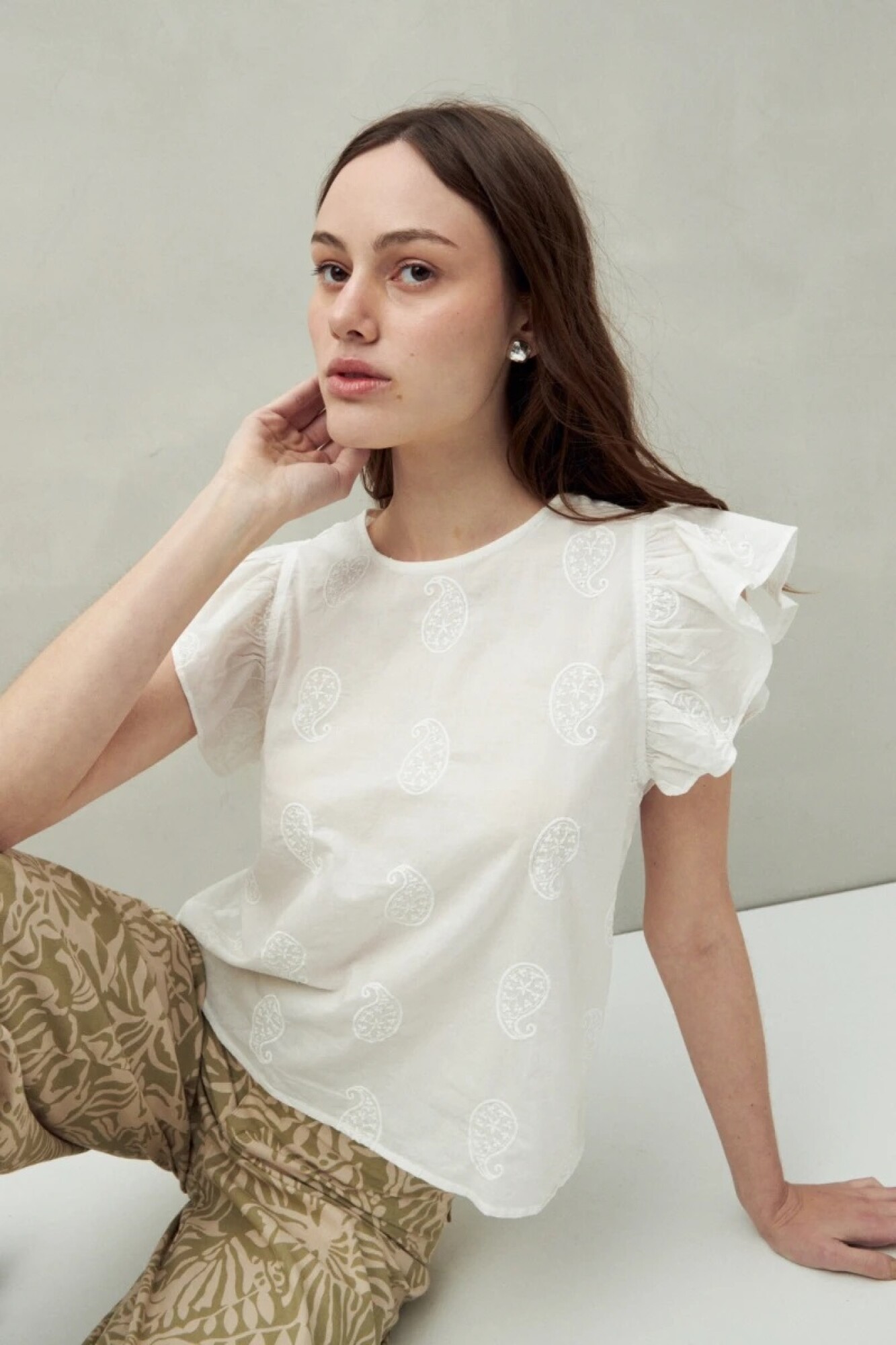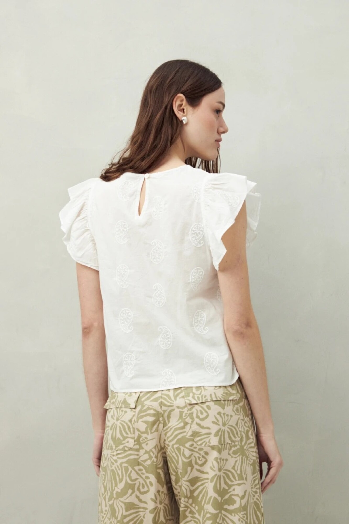 $ 1.352 Blusa de algodón con delicado bordado paisley y volados en las mangas que aportan un toque romántico y femenino. Su estructura liviana y el detalle texturado lo convierten en una prenda ideal para looks frescos con aire artesanal.