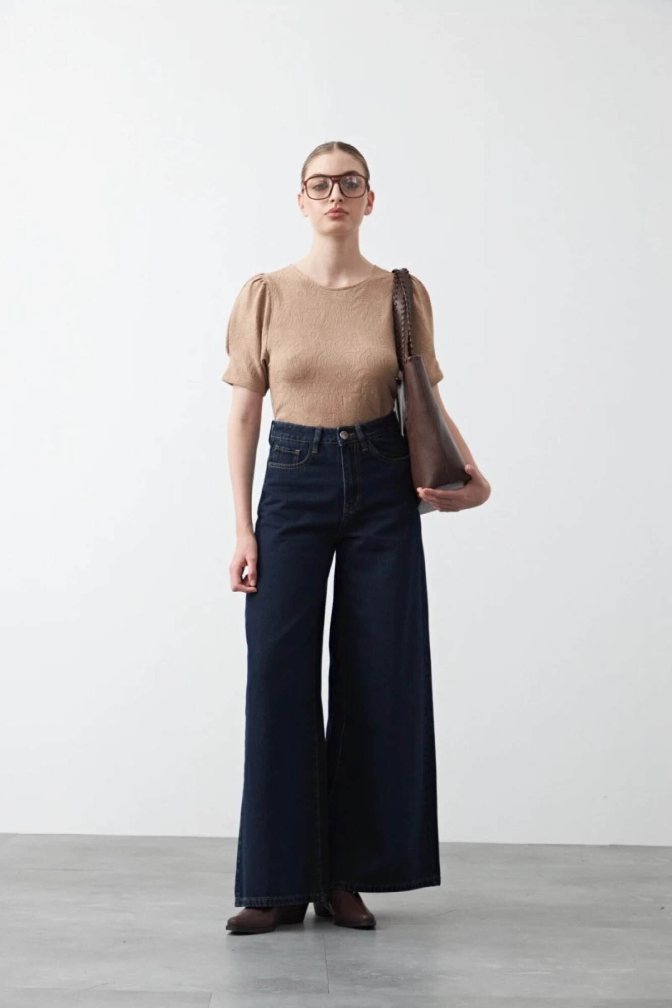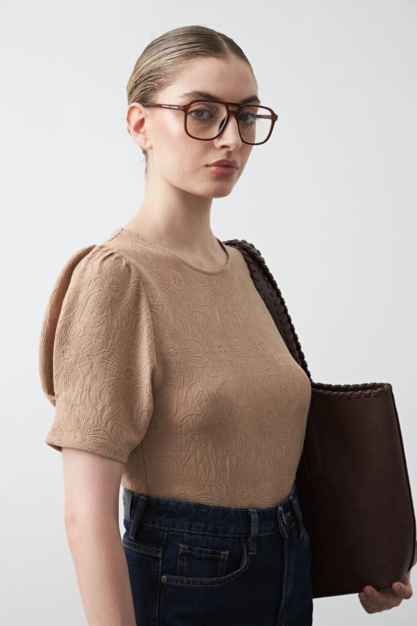 $ 792 Bluza de manga corta con textura floral en relieve y diseño de inspiración romántica. La superficie trabajada aporta profundidad visual y un diferencial sutil, mientras que las mangas abullonadas suman estructura y equilibrio.