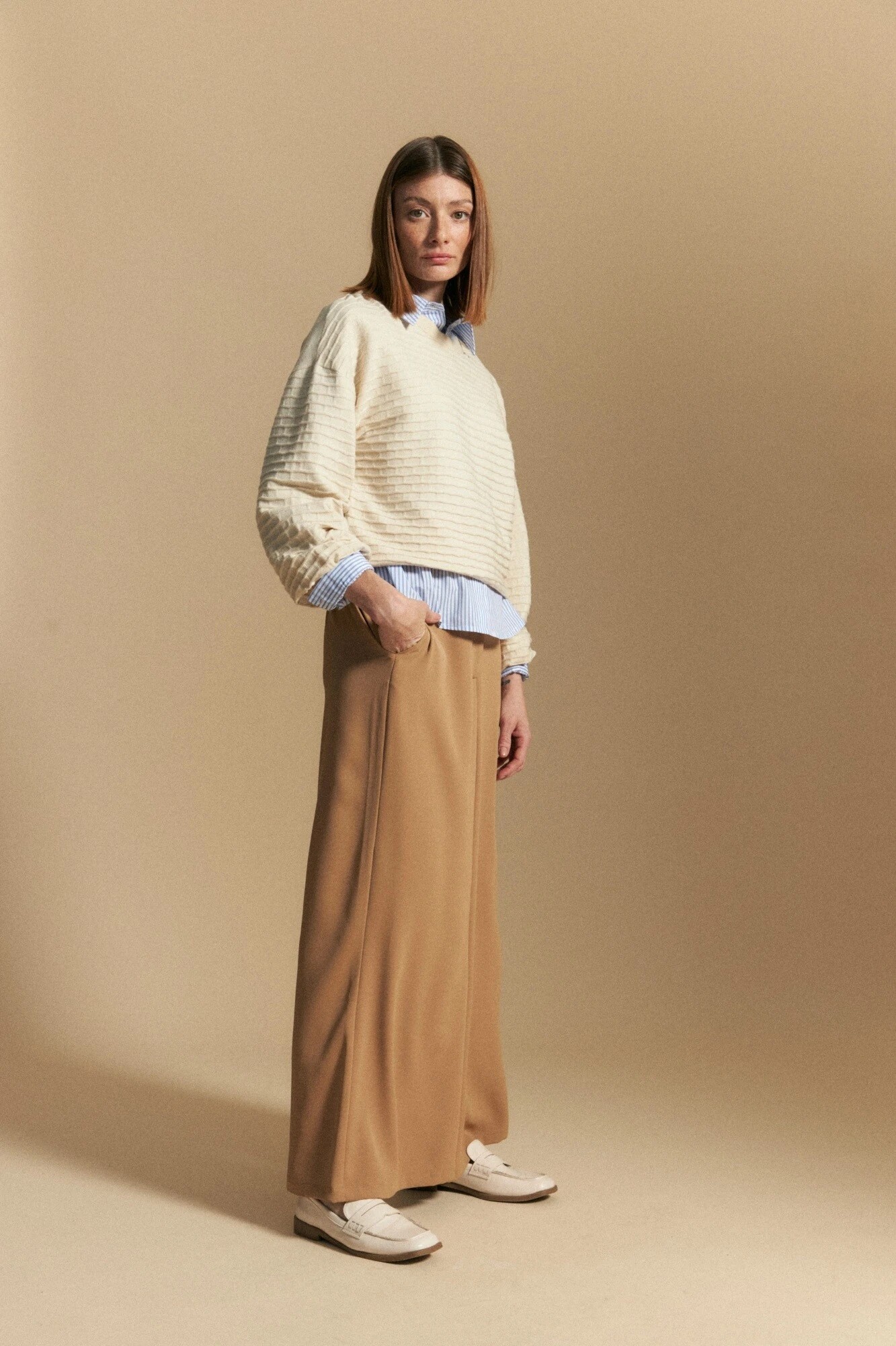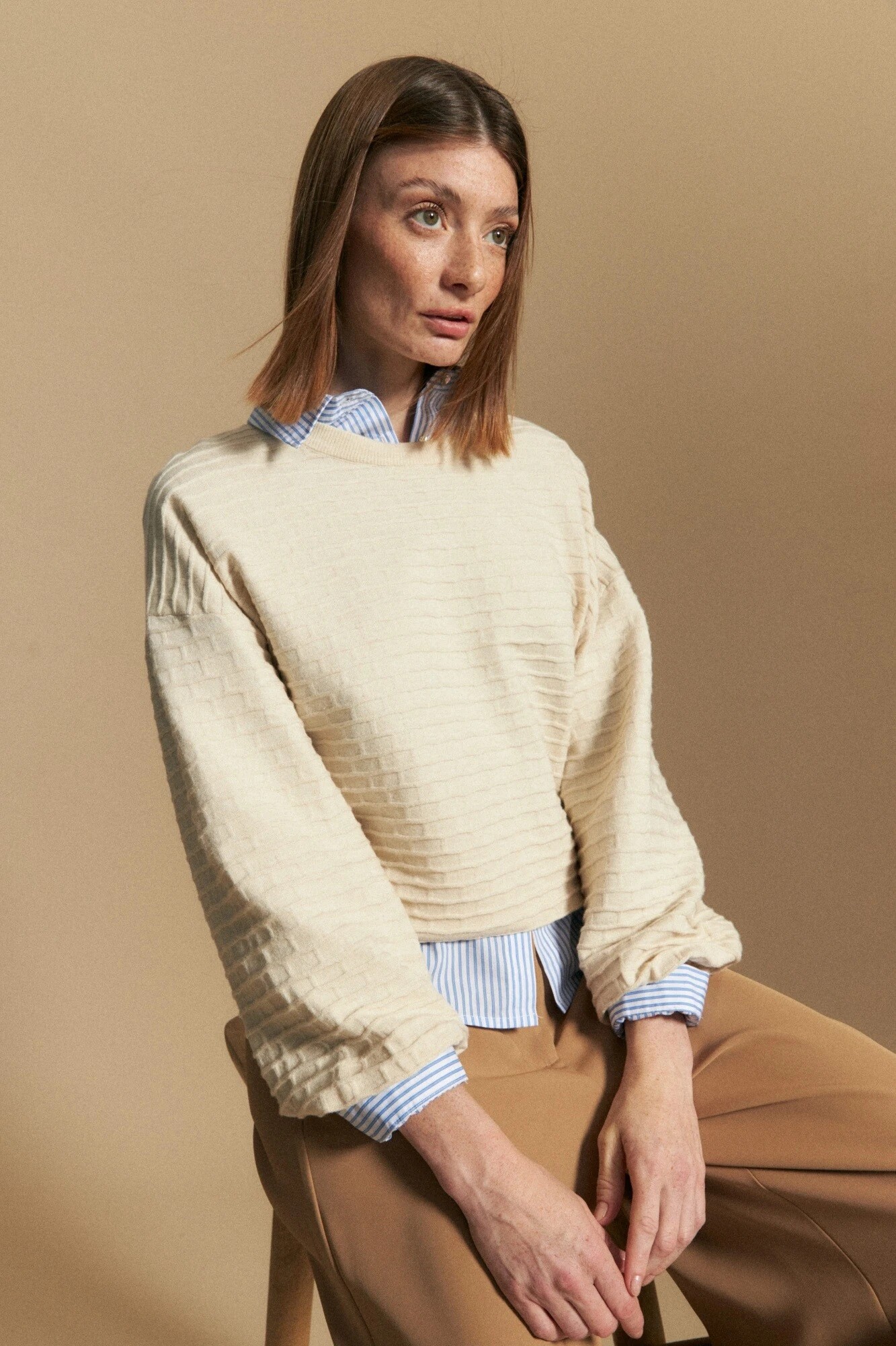 Buso de mangas abullonadas con textura tejida en relieve que aporta dimensión y un detalle diferencial. Su silueta amplia se equilibra con puños elastizados, generando volumen controlado y un calce cómodo. Ideal para sumar carácter a looks de día u office, combinándolo con denim o pantalones sastreros para un estilismo actual y sofisticado.