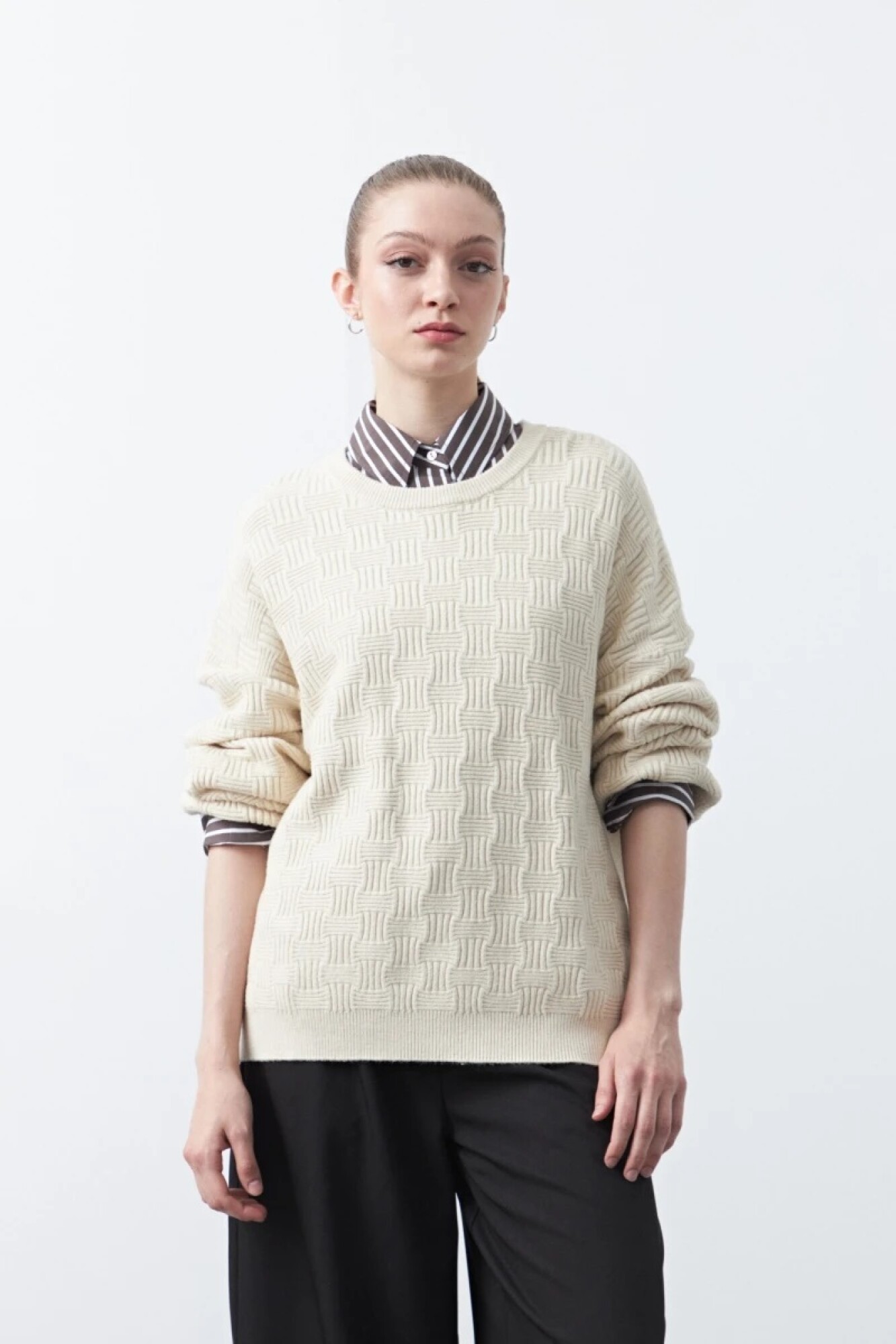 Buzo tramado, de diseño clásico y textura protagonista que aporta profundidad visual y un acabado cuidado. El tejido con relieve genera un efecto sutil pero distintivo, elevando la prenda más allá de un básico tradicional. De calce cómodo y líneas limpias, es una opción versátil que funciona tanto en looks urbanos como en combinaciones más prolijas, ideal para sumar interés al outfit sin perder elegancia.