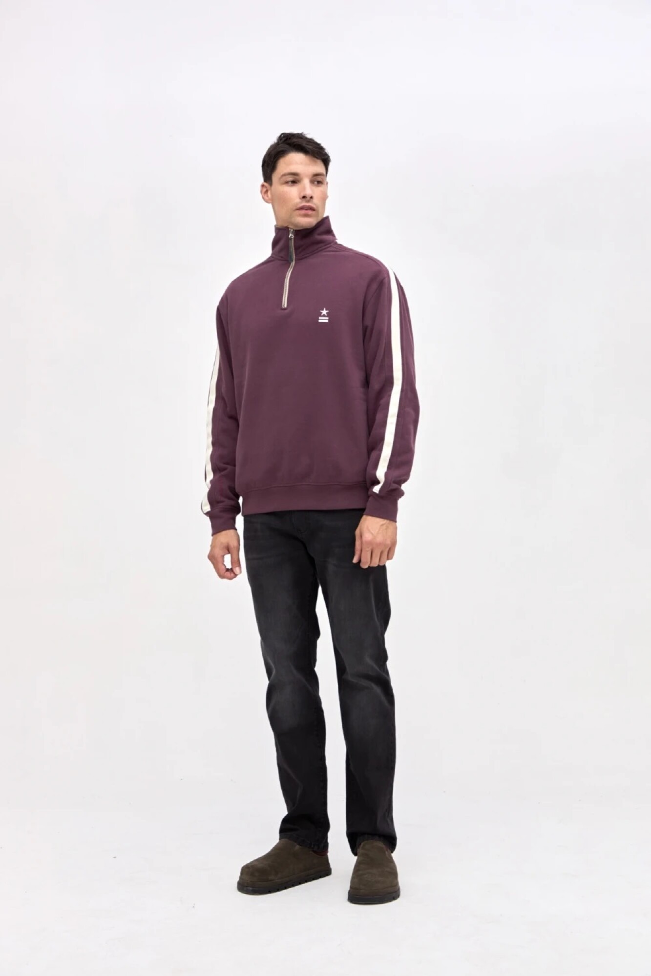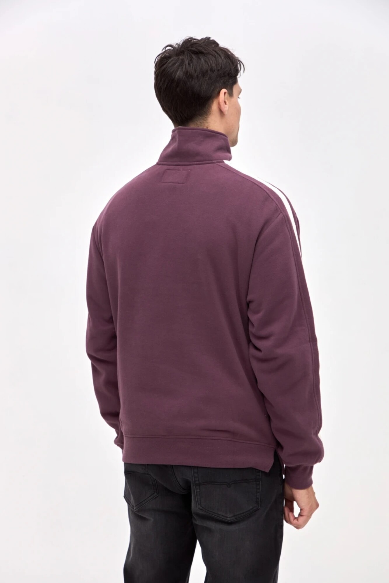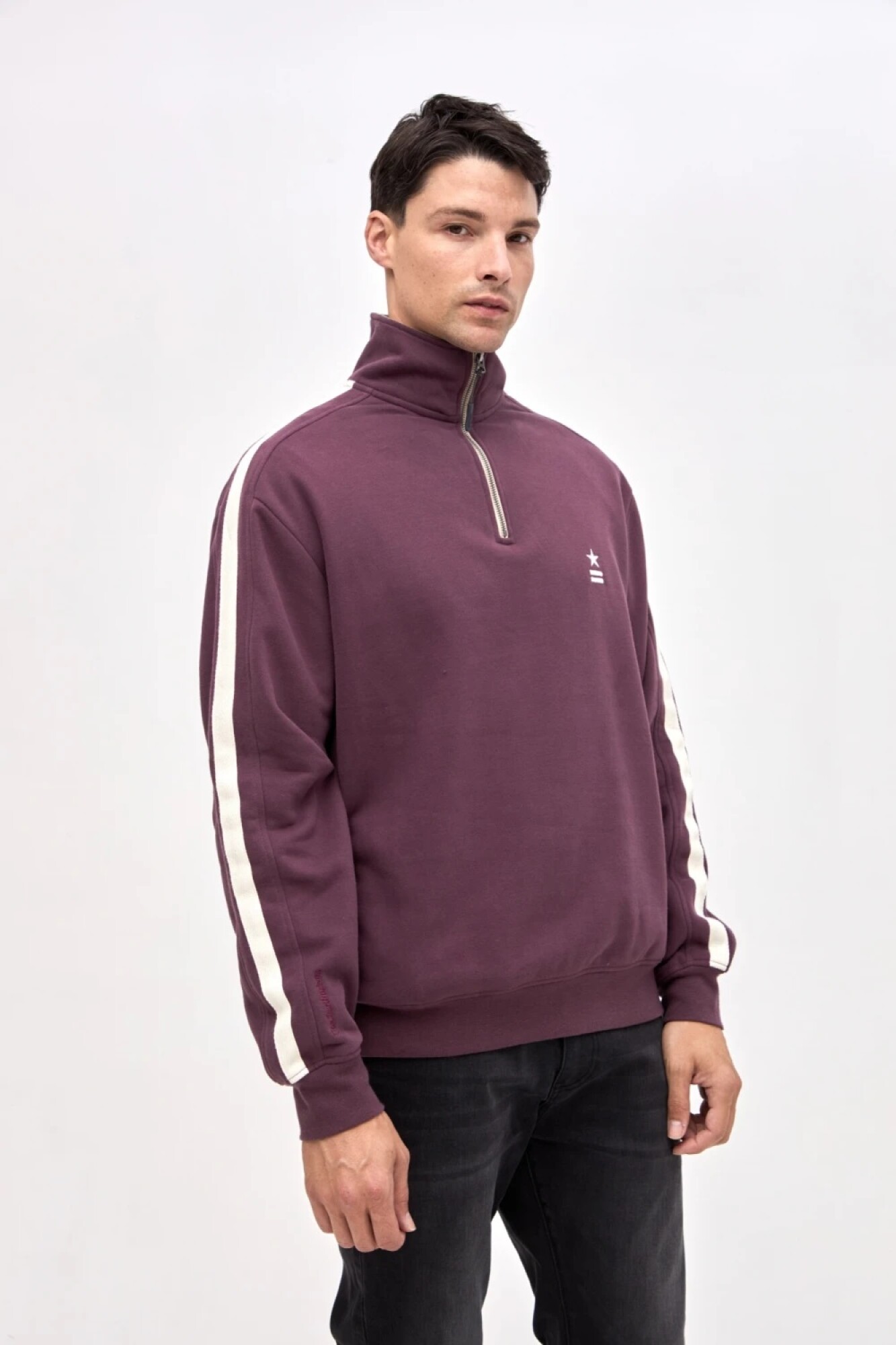 $ 1.832 Buzo con medio cierre en felpa con friza. Detalle de cortes en mangas con cinta de algodón a contratono. Cierre metálico. Bolsillos laterales. Bordado de marca en pecho y manga. Calce clásico.