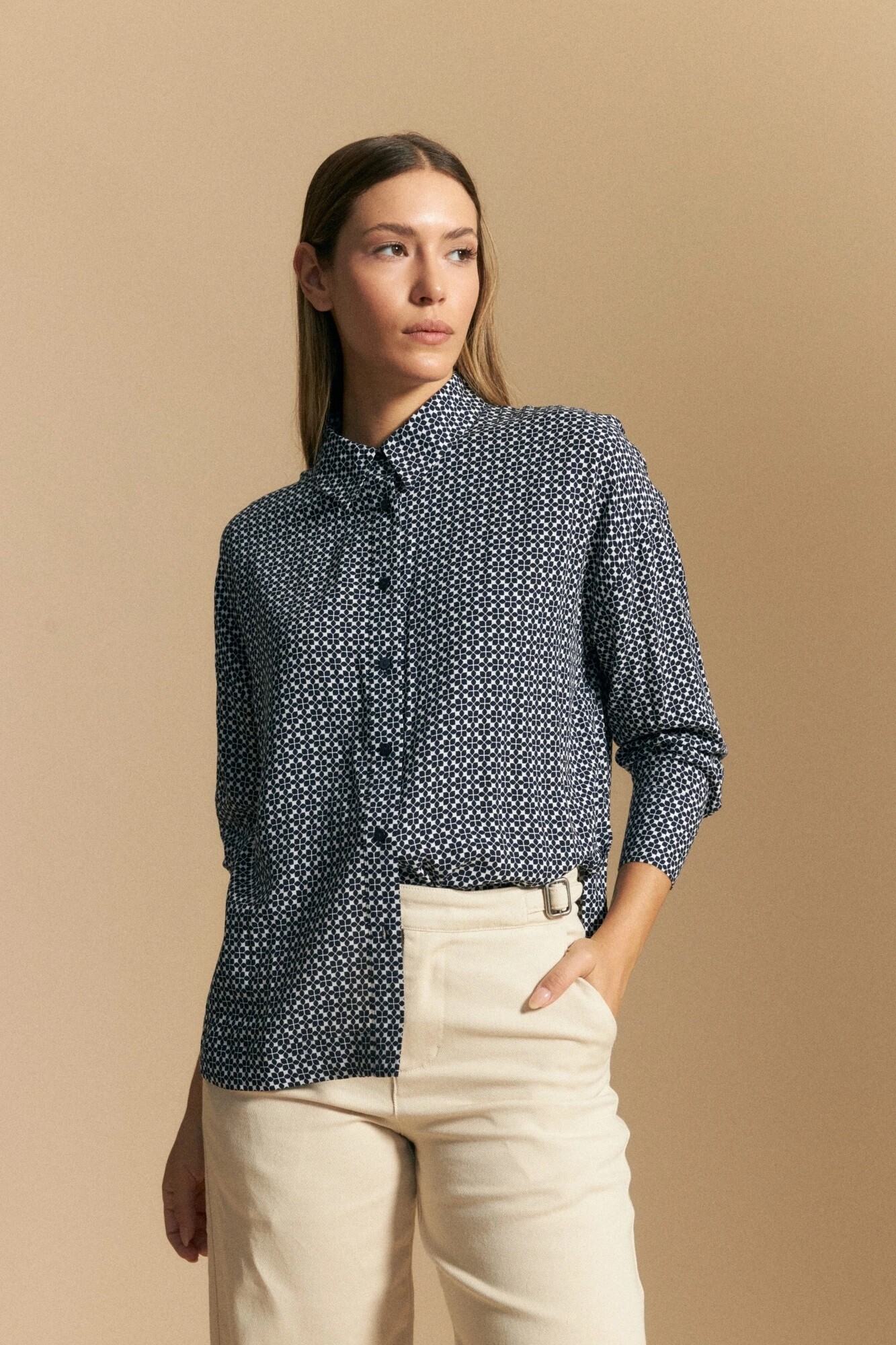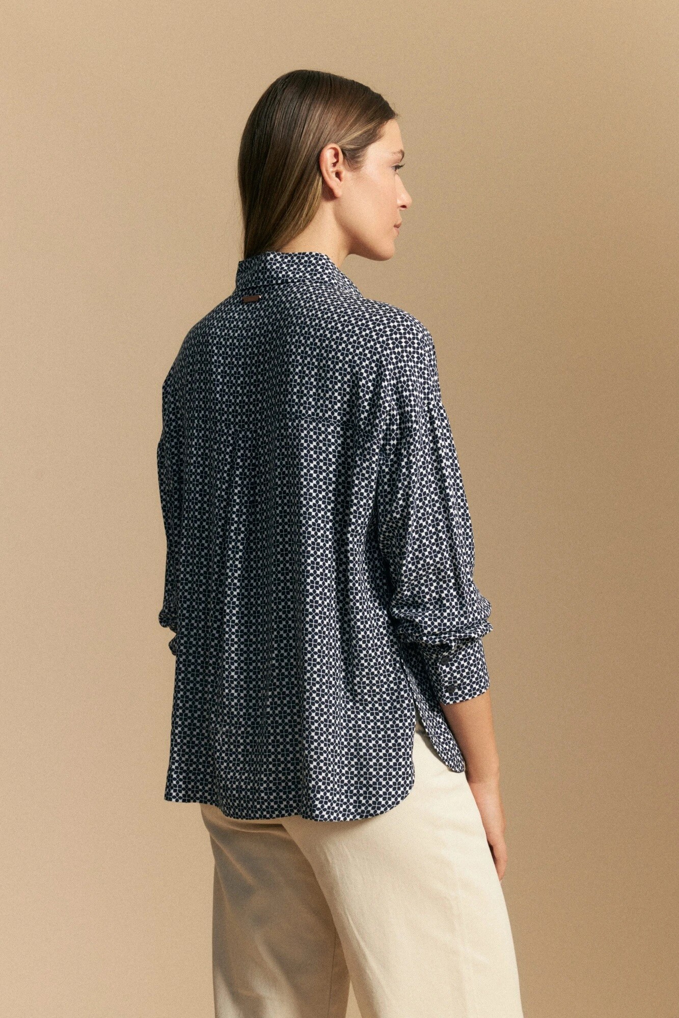 Camisa de manga larga de silueta relajada, un clásico de oficina renovado por el estampado que suma personalidad sin perder elegancia. El diseño de cuello camisero y botones al frente aporta prolijidad, mientras que el tejido liviano acompaña el movimiento y garantiza comodidad durante toda la jornada.