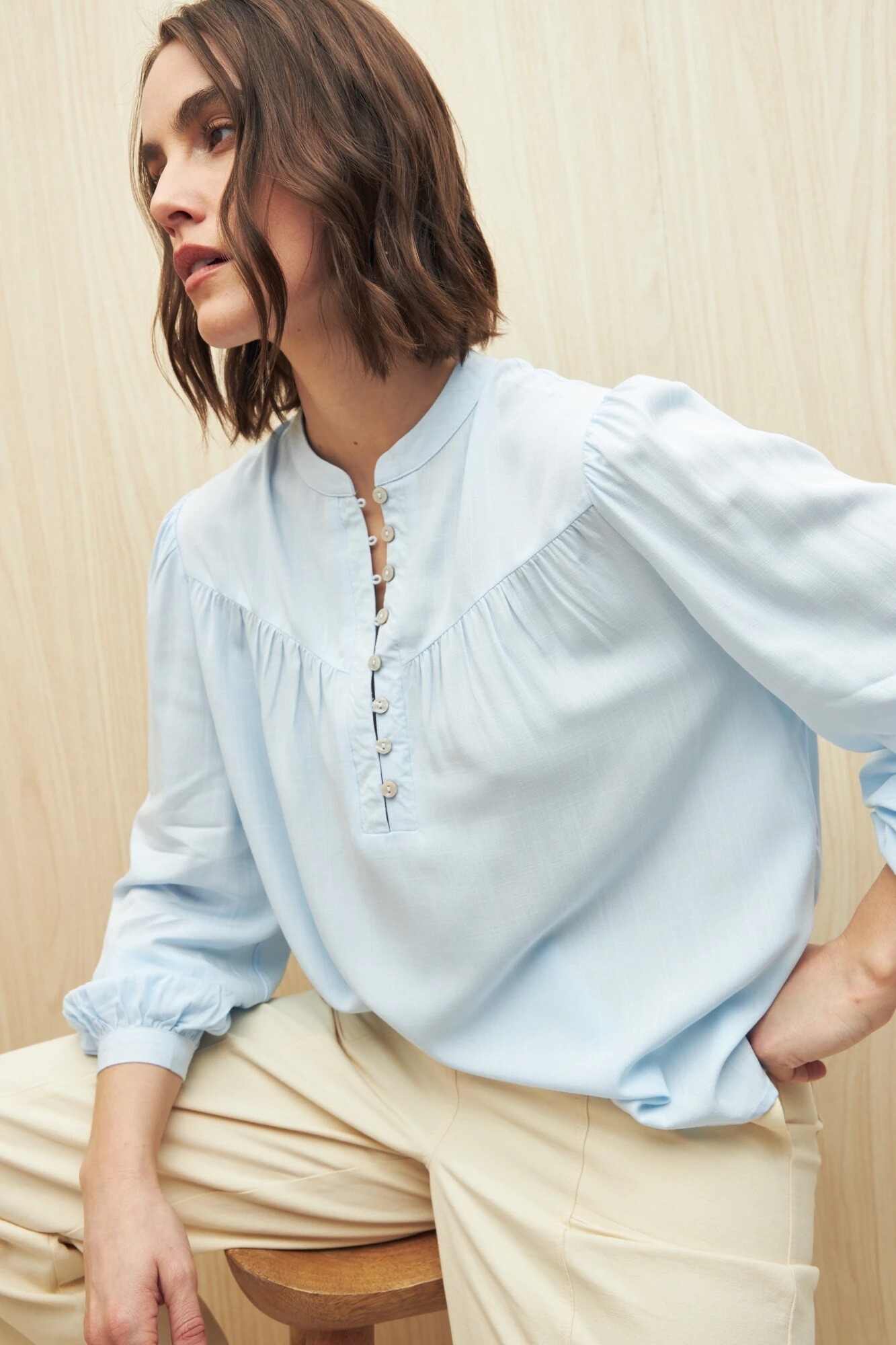 Camisa de manga larga en viscosa suave, con cuello mao y una botonadura parcial al frente que aporta un aire clásico y elegante. El detalle de frunces en los hombros y los puños abotonados le suman delicadeza y estilo, ideal para elevar un look de oficina o acompañar un outfit más relajado.