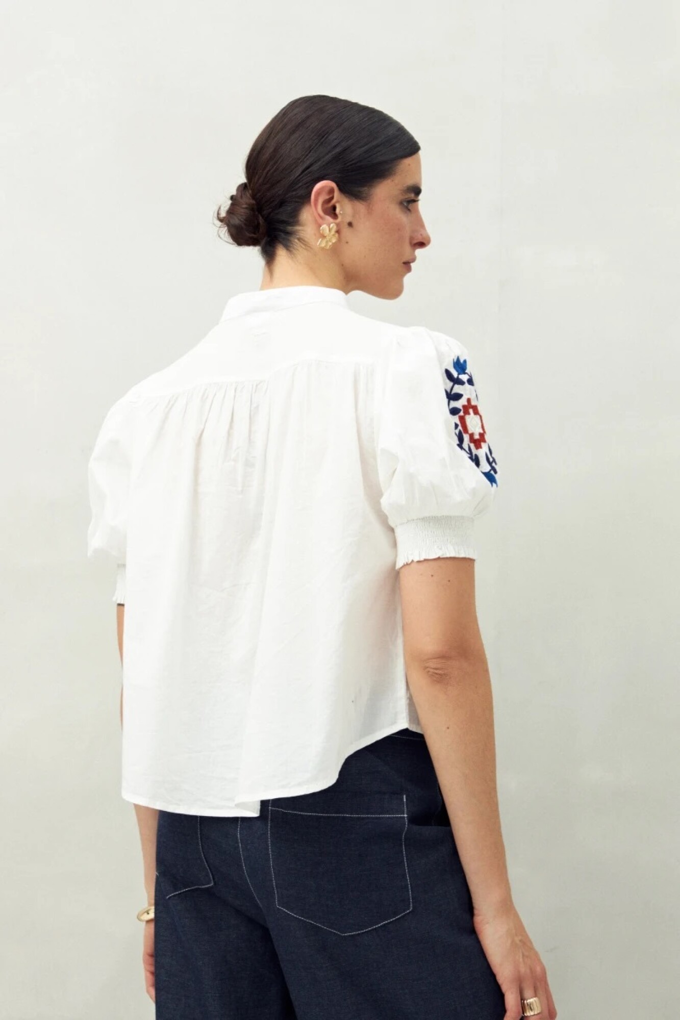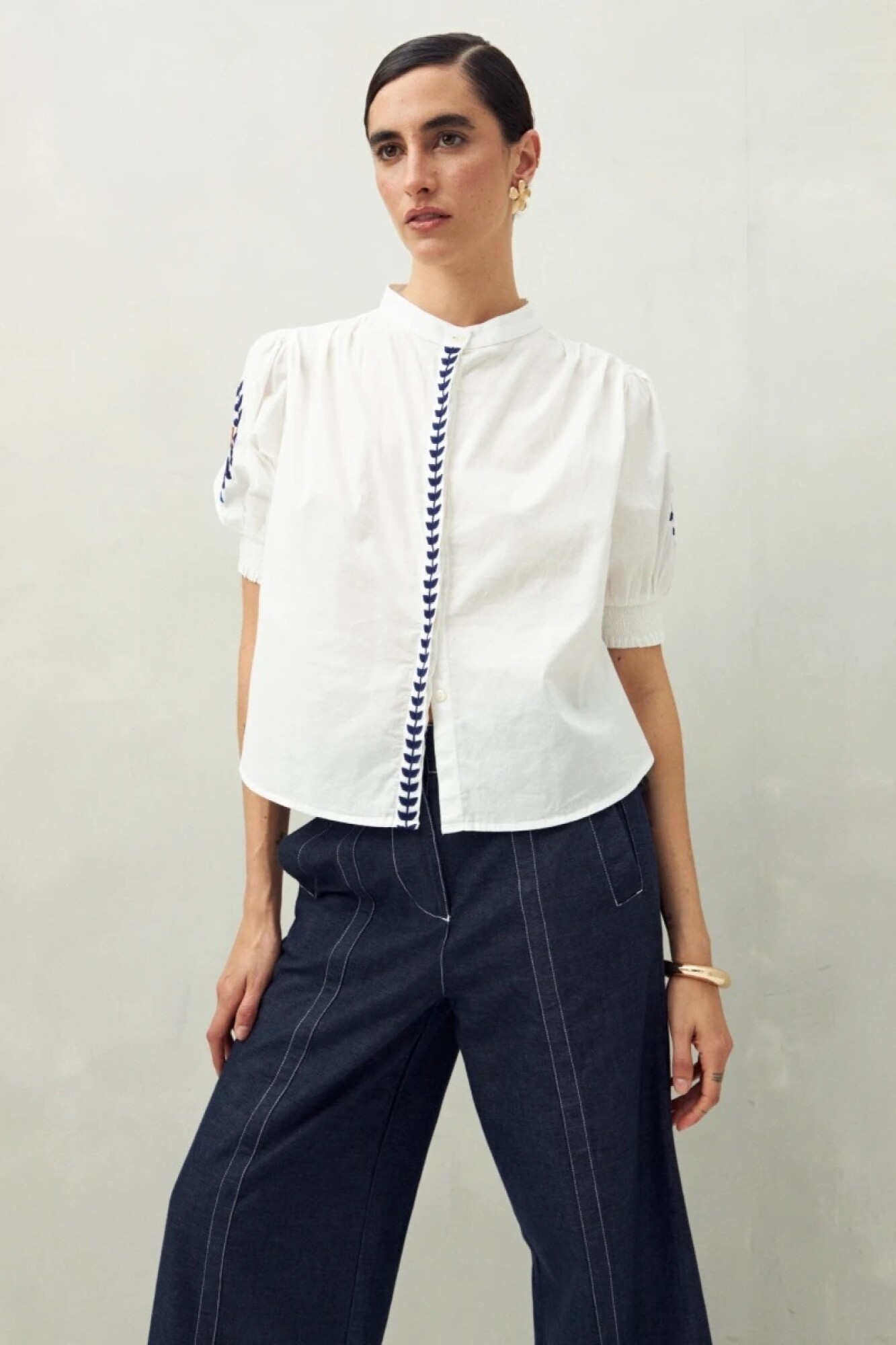 Camisa de mangas abullonadas con bordados a contratono que recorren el frente y los hombros, aportando un aire artesanal y femenino. Con cuello mao y puños elastizados, combina detalles delicados con una silueta relajada y contemporánea. Ideal para elevar un look casual con un toque distintivo.