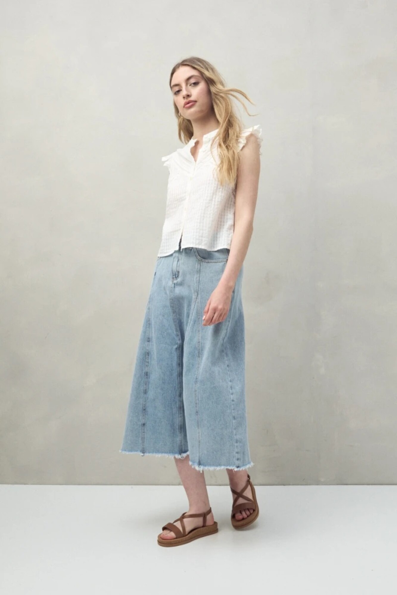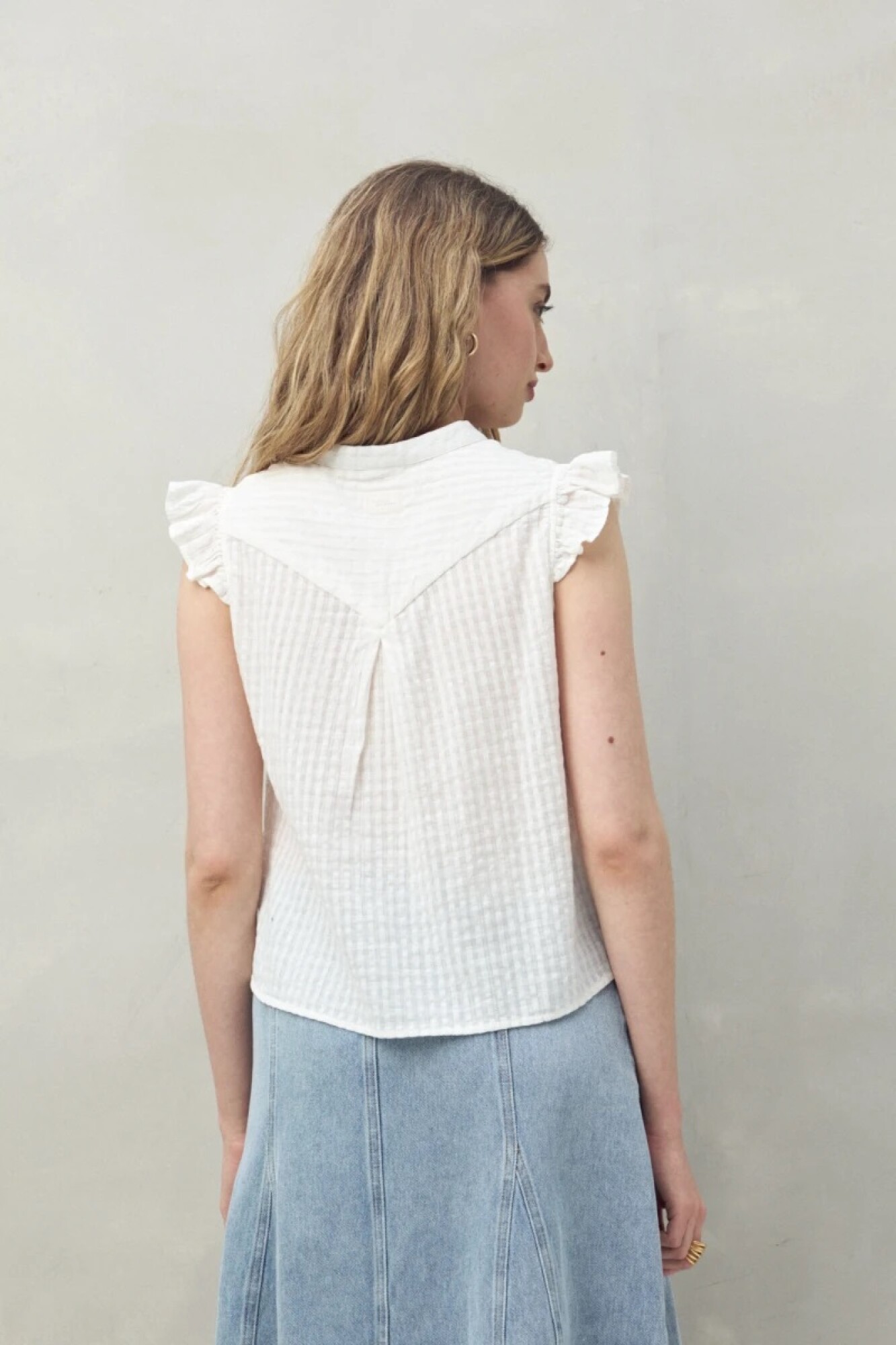 Una versión fresca y femenina de la clásica blusa de algodón. Su tejido cuadrillé aporta textura y movimiento, mientras las delicadas tiras de encaje dibujan líneas diagonales que estilizan la silueta. El cuello Mao con sutil escote y los pequeños volados en los hombros completan un diseño romántico y veraniego, perfecto para combinar con jeans, shorts o faldas fluidas.