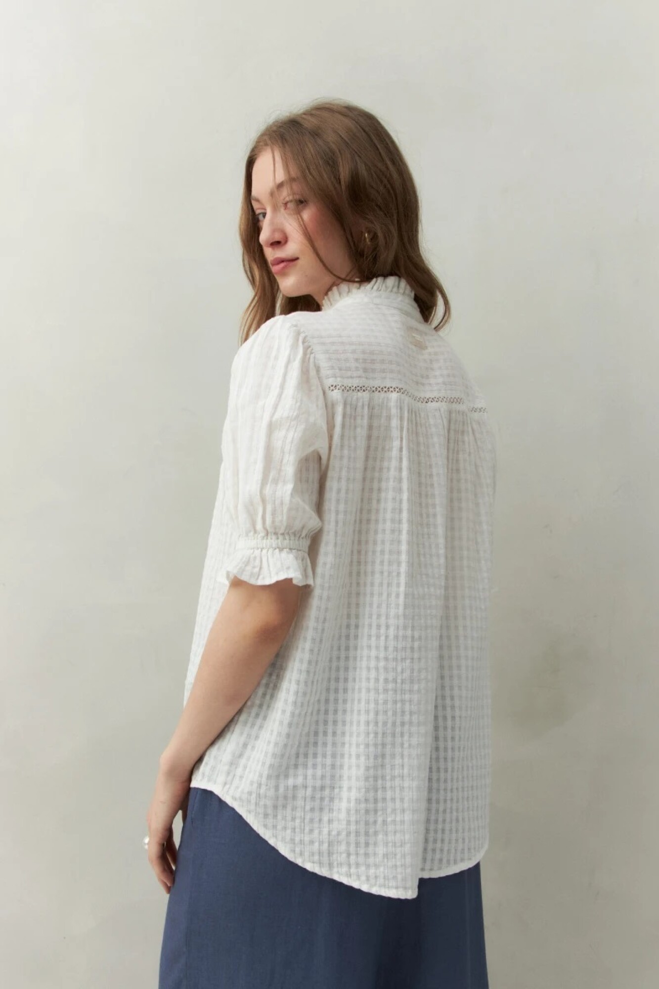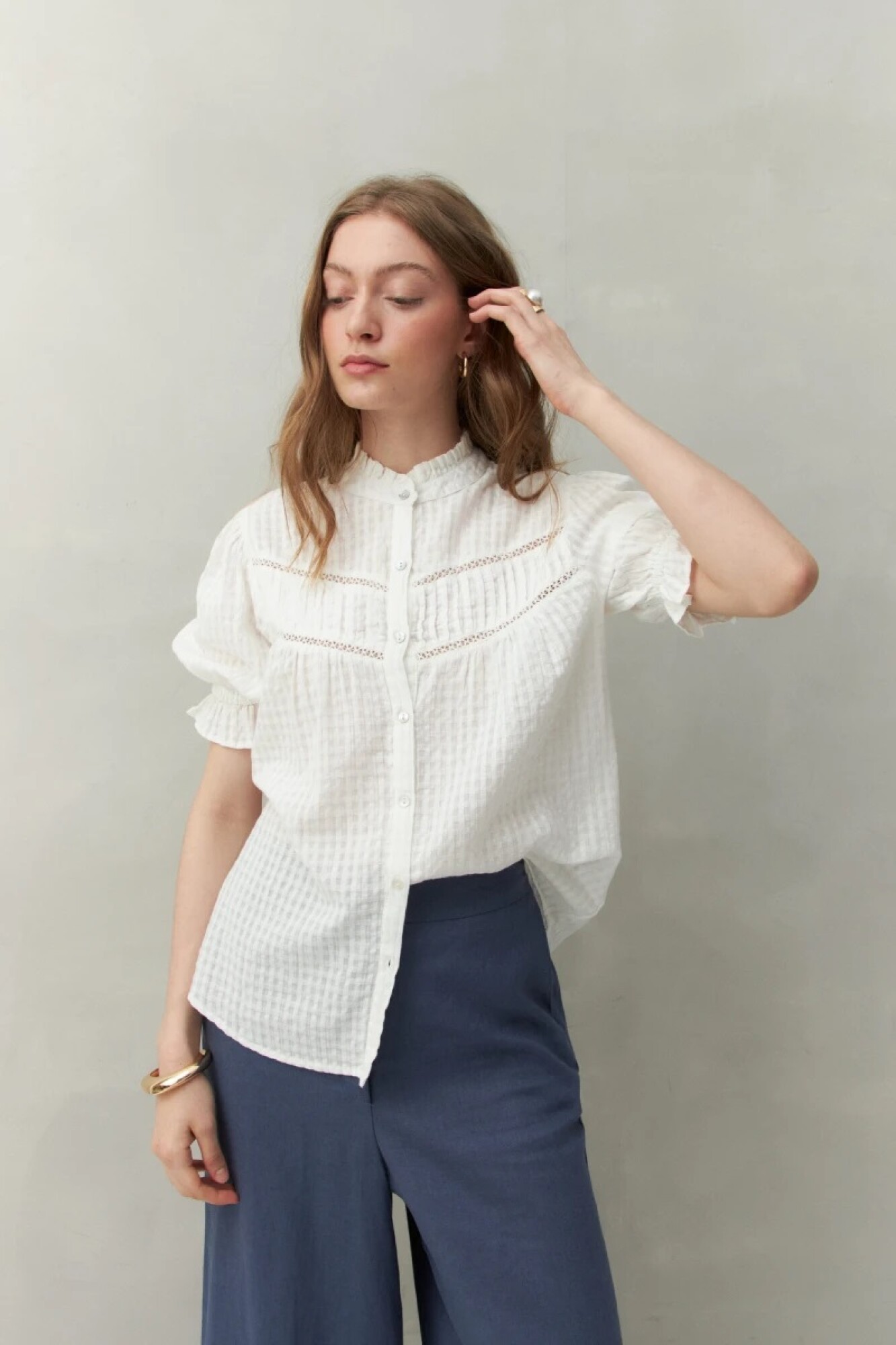 Una prenda que redefine lo romántico con un aire moderno. Esta camisa está confeccionada en gasa de algodón con textura cuadrillé, y presenta delicadas inserciones de encaje lineal que recorren el frente, generando un sutil juego de transparencias. Su cuello con pequeños volados y mangas abullonadas con puño elástico aportan un encanto femenino y fresco, ideal para los días cálidos.