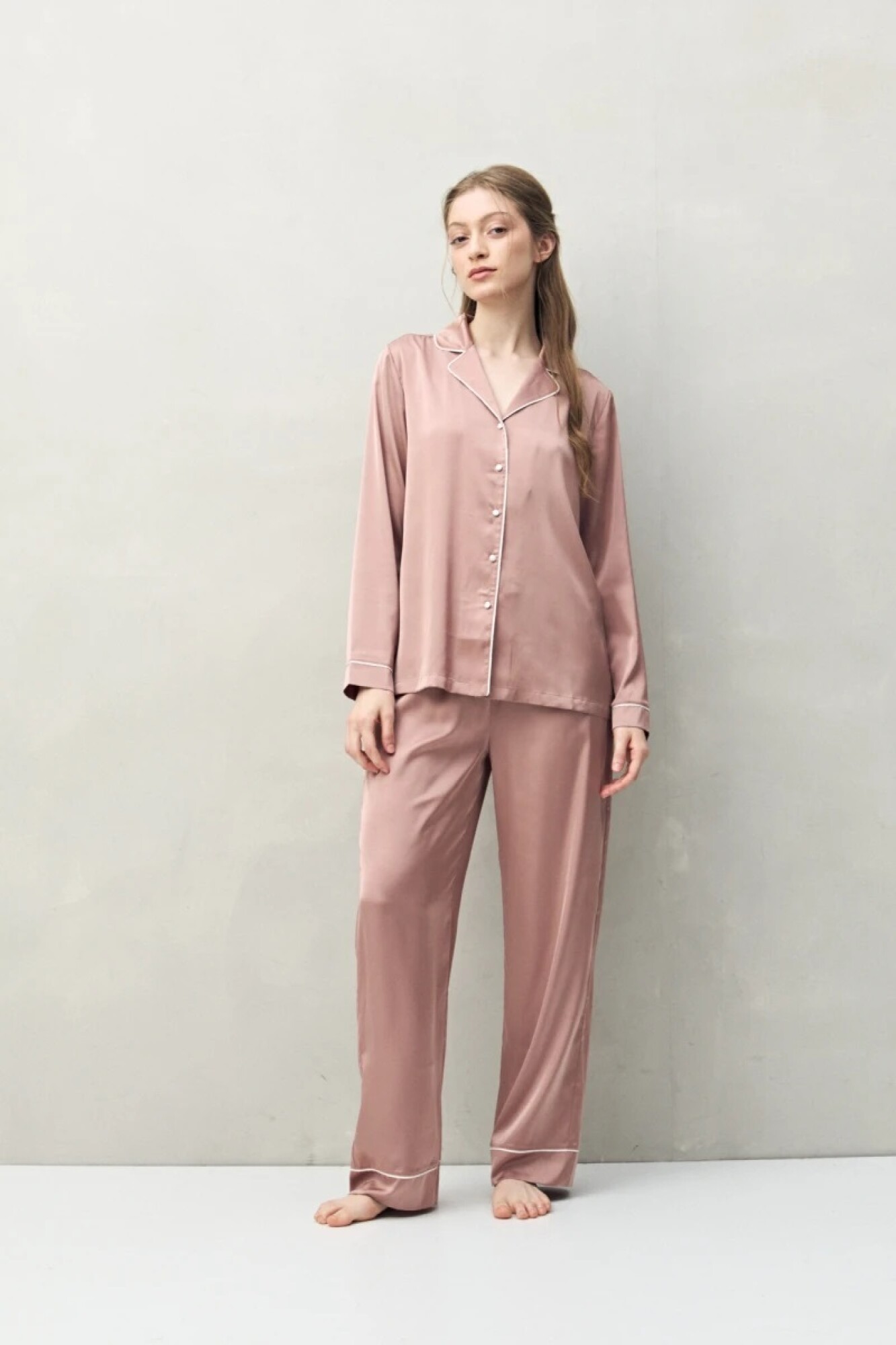 Confeccionada en tejido satinado con leve elasticidad, se destaca por su caída suave y confortable. Presenta cuello camisero, cierre frontal con botones y detalles de vivo que realzan el diseño con un acabado prolijo y delicado. Una prenda pensada para el descanso, que combina comodidad y una estética elegante.