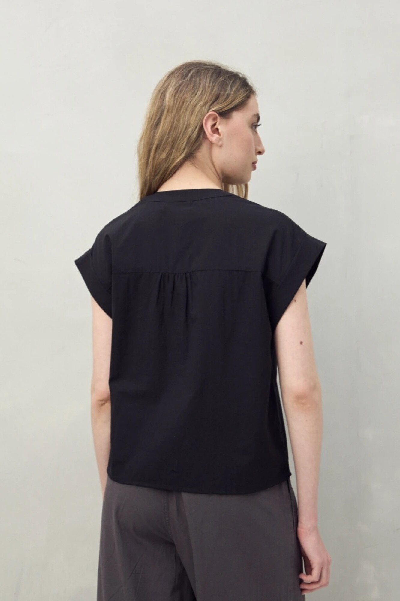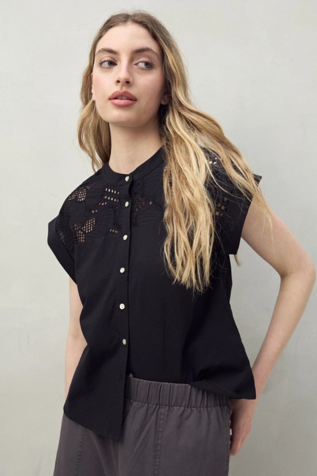 Camisa sin mangas confeccionada en 100% algodón, con delicados calados y bordados que aportan textura y un aire artesanal. Su cuello mao y abotonadura central le dan un toque moderno y versátil, ideal para combinar con jeans o pantalones amplios. Una prenda fresca y femenina, clave para elevar cualquier look de verano.