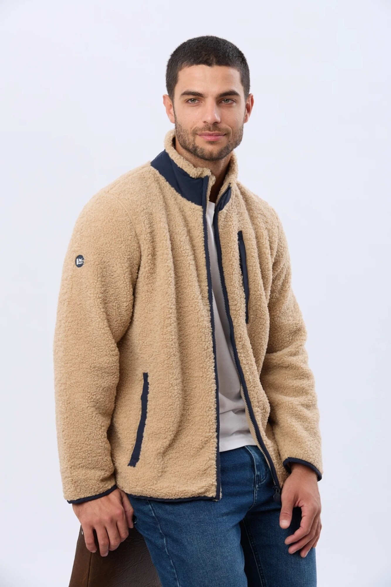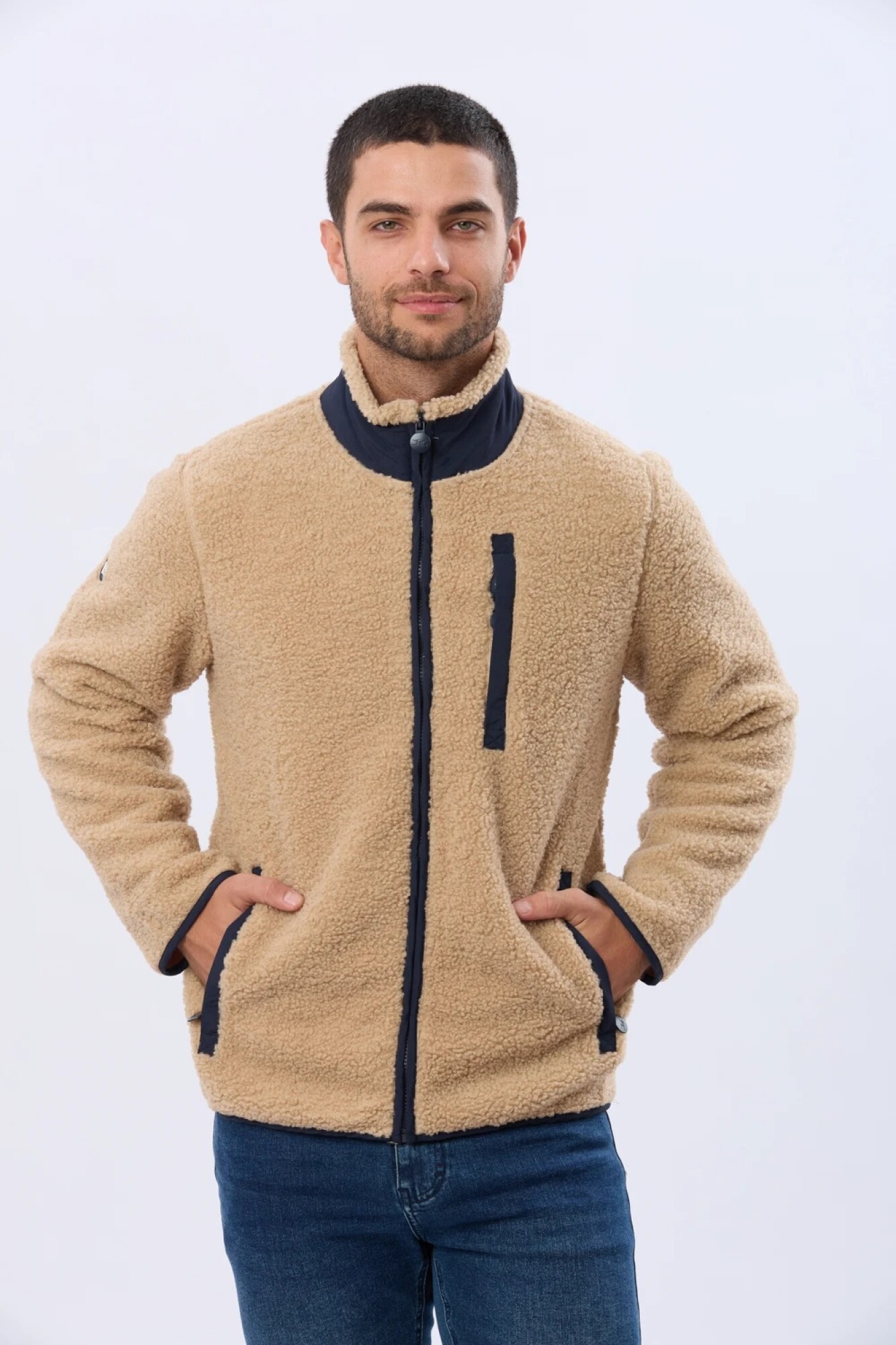 $ 2.152 Campera de corderito con interior en polar cuenta con bolsillos laterales ,un bolsillo vertical en el pecho con cierre y un bolsillo en el interior ,cuello alto y detalles en contraste.