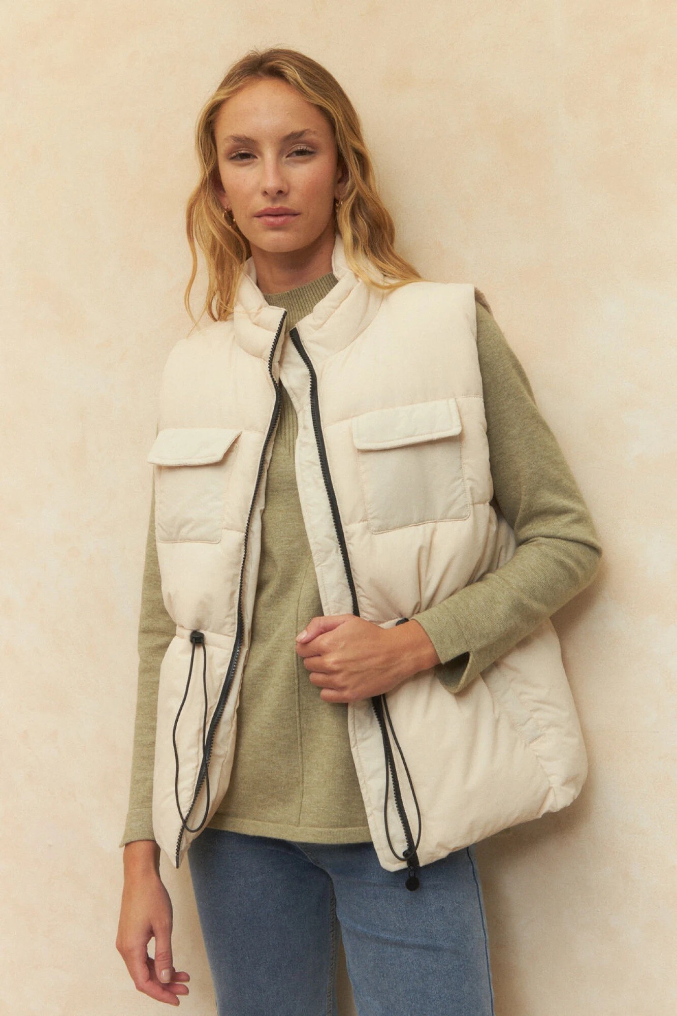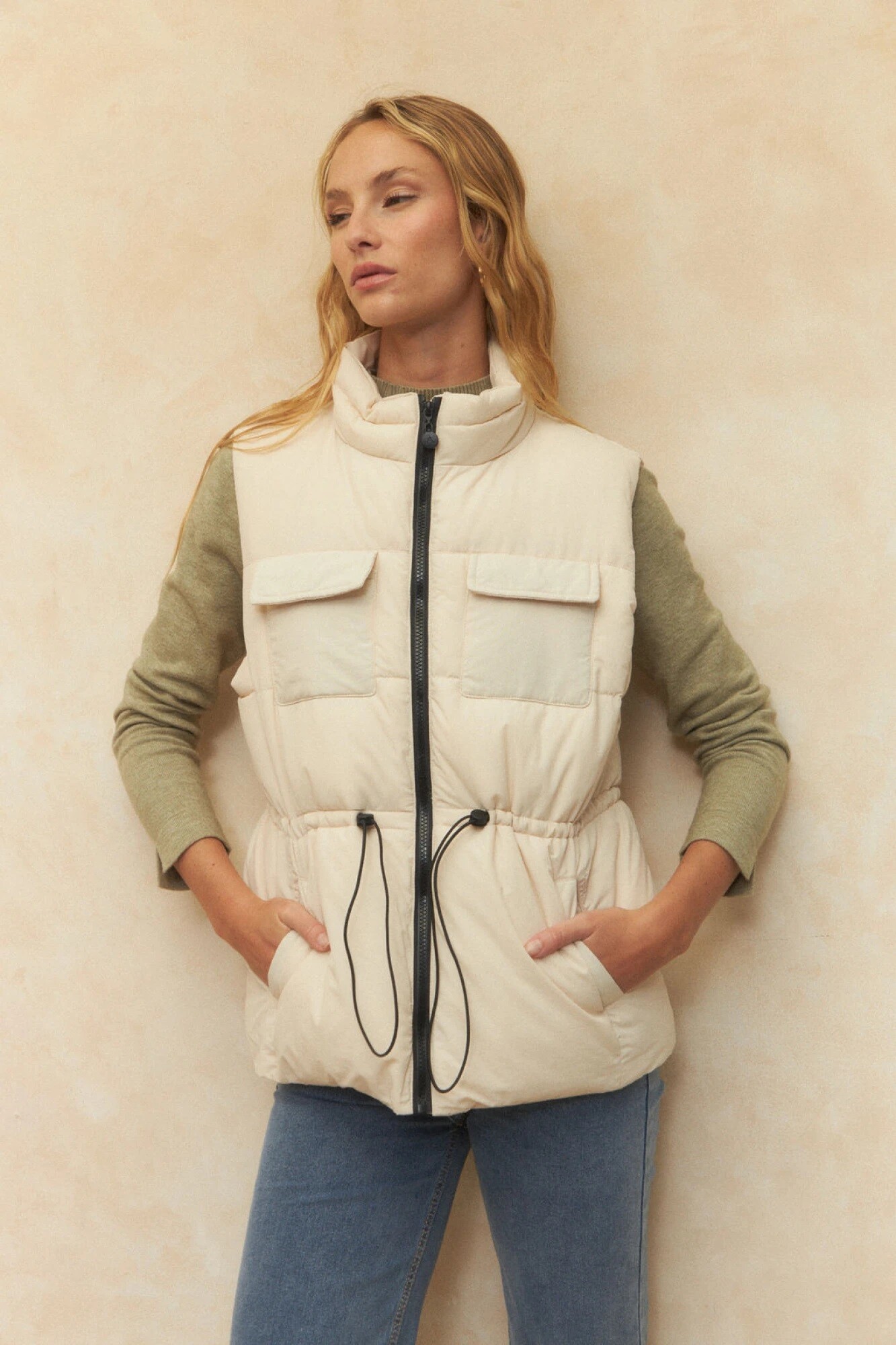 $ 1.352 Chaleco puffer de cuello alto, cierre y cuatro bolsillos, dos laterales y dos más frontales con solapa, además cuenta con cintura ajustable.