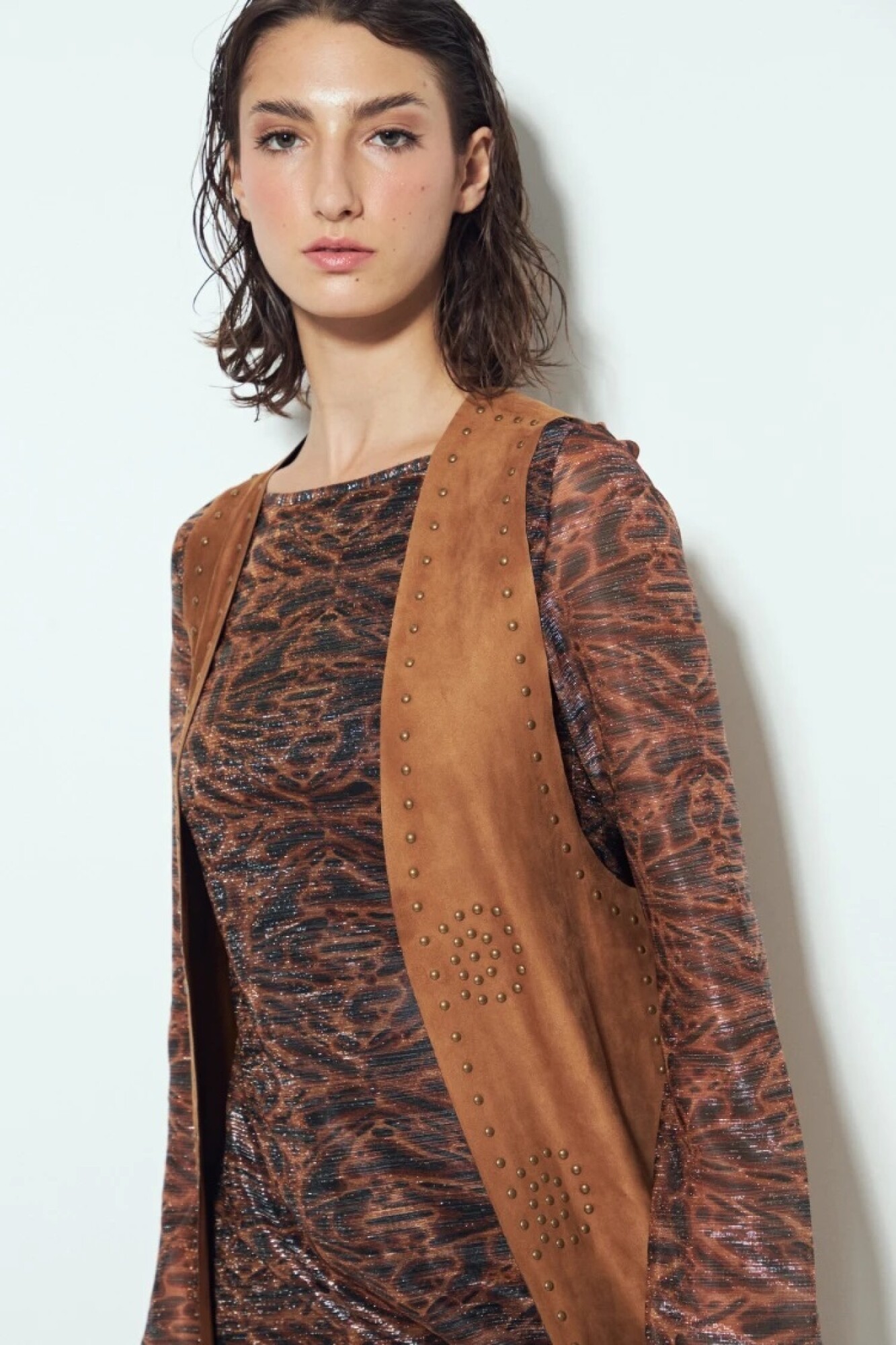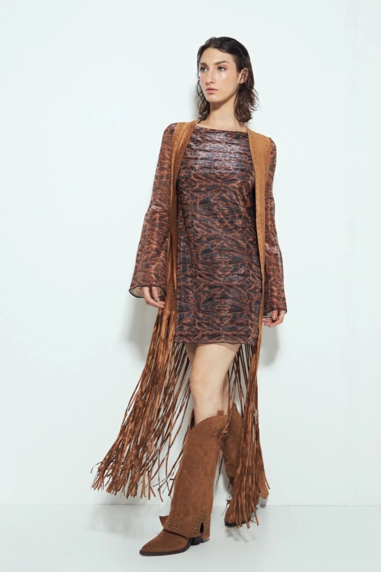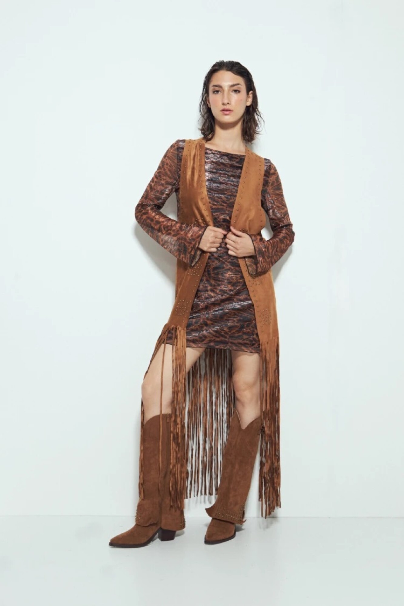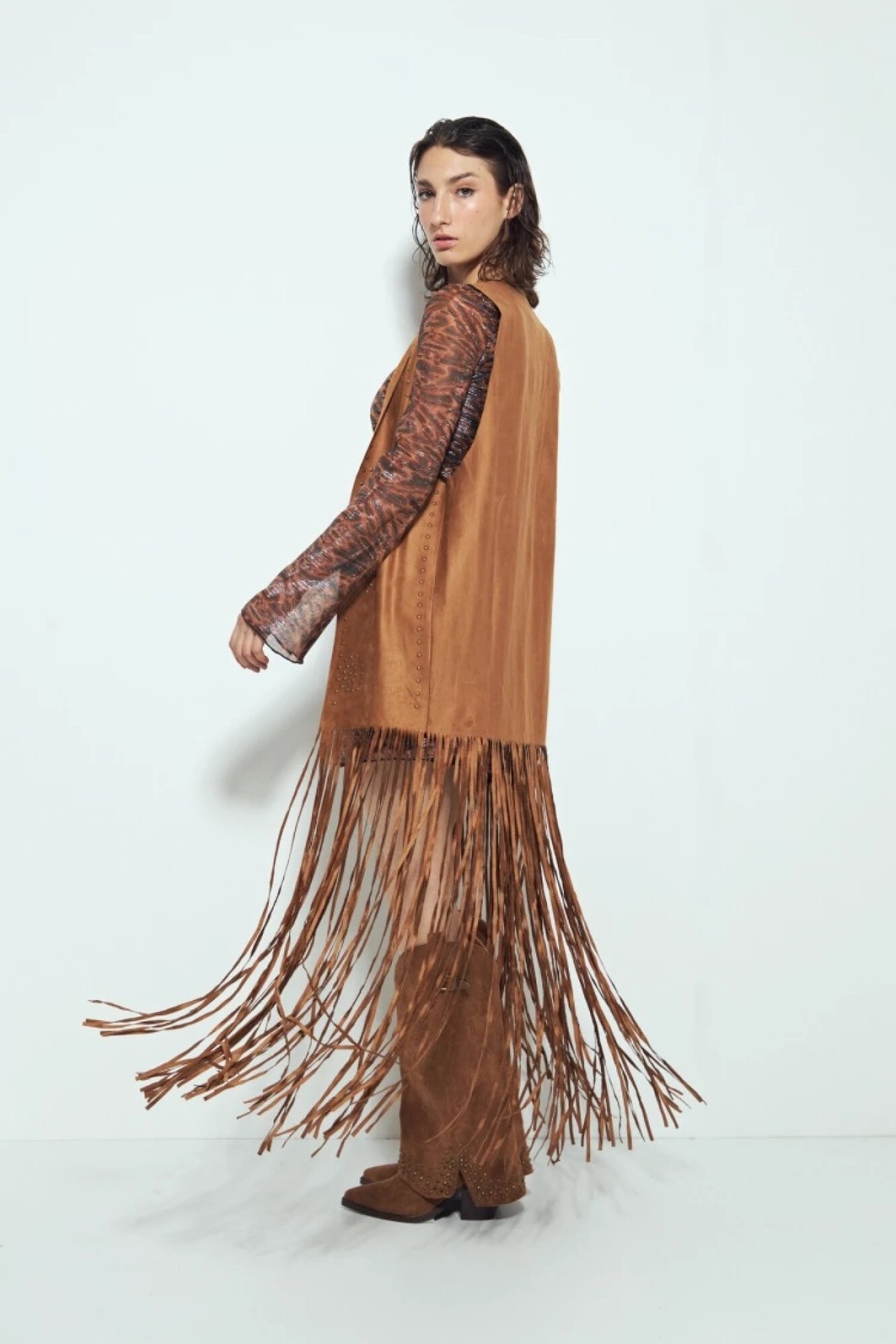 $ 1.992 Chaleco largo con flecos y apliques metálicos.