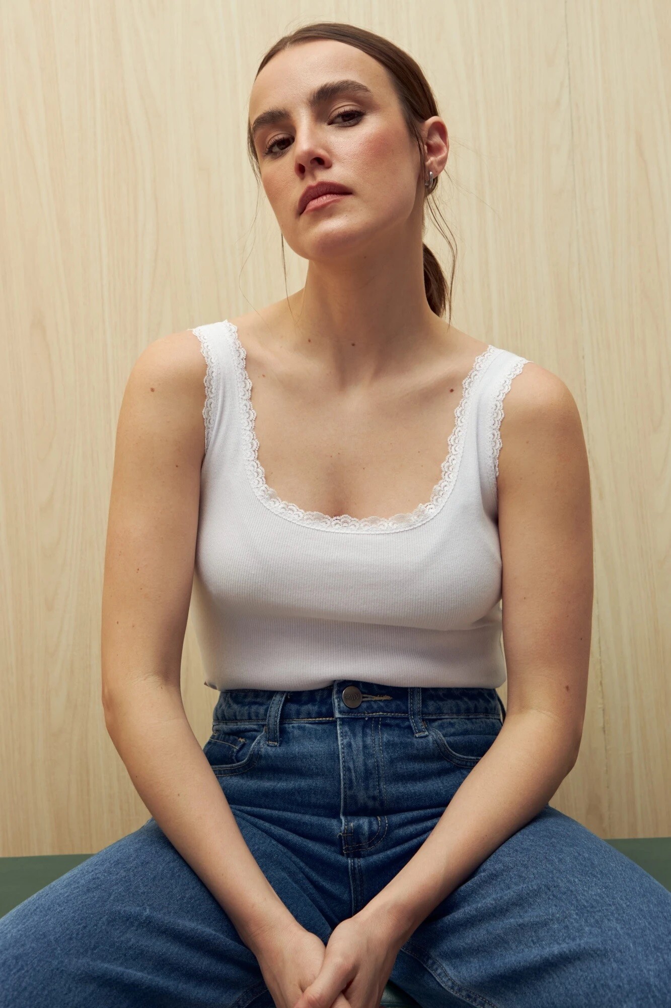 Musculosa con escote cuadrado y delicado detalle de encaje en el borde. Su tejido con leve elasticidad se adapta al cuerpo manteniendo la comodidad y realzando la silueta. Un imprescindible del guardarropa, ideal para usar solo o como primera capa bajo camisas, blazers o sweaters.