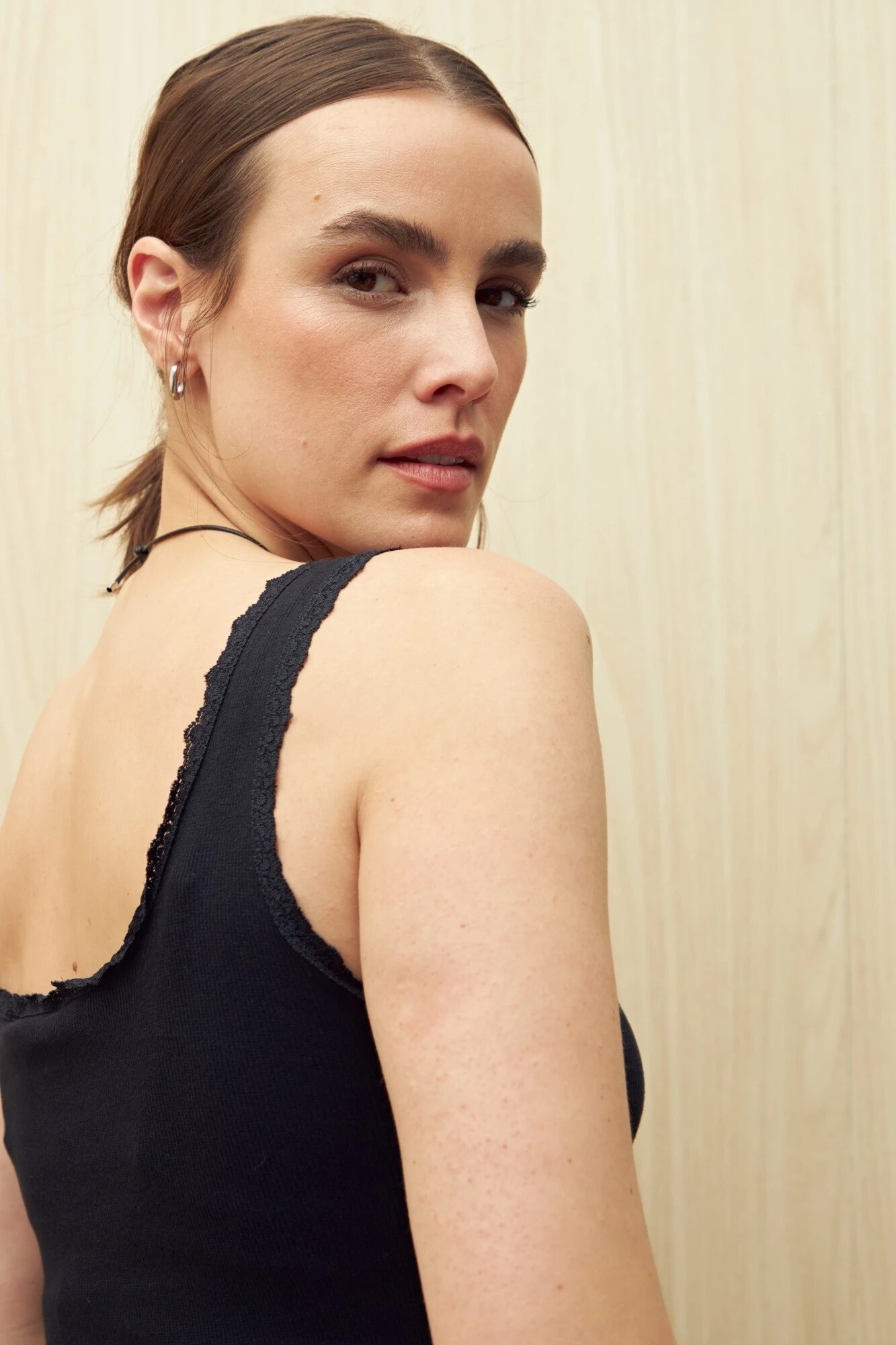 Musculosa con escote cuadrado y delicado detalle de encaje en el borde. Su tejido con leve elasticidad se adapta al cuerpo manteniendo la comodidad y realzando la silueta. Un imprescindible del guardarropa, ideal para usar solo o como primera capa bajo camisas, blazers o sweaters.