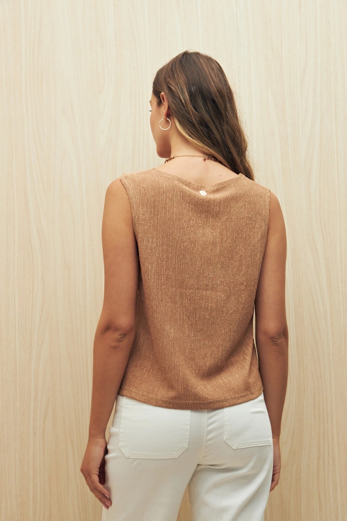 $ 552 Musculosa con cuello a la base, confeccionado en un tejido texturizado que aporta carácter sin perder elegancia. Ideal para combinar con prendas de distintos estilos y elevar tus looks del día a la noche.