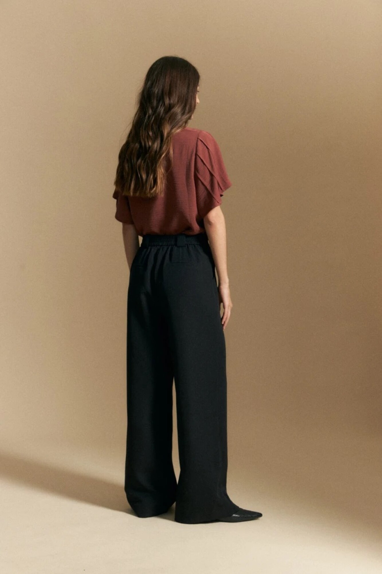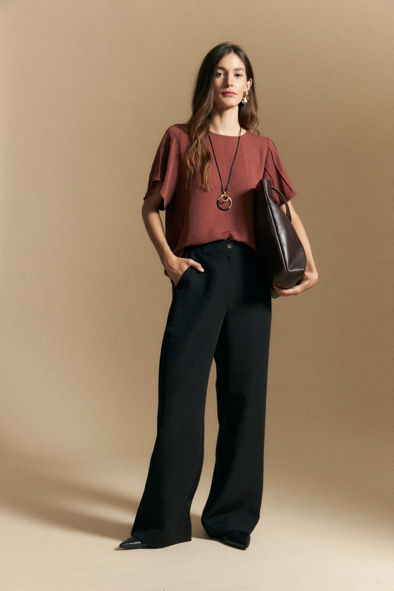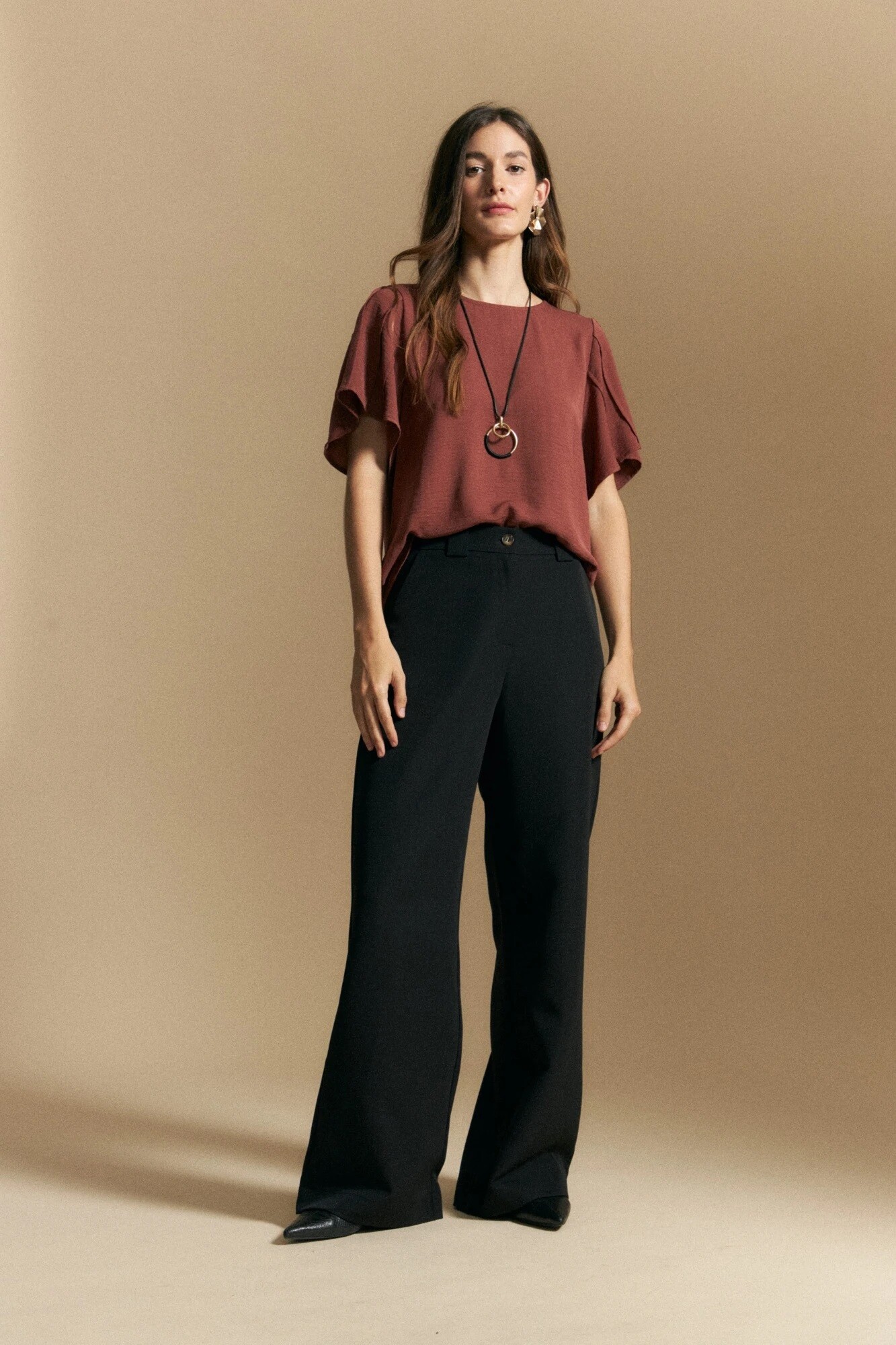 Pantalón ancho clásico de office de silueta recta y caída prolija, pensado para lograr un look profesional con un aire actual. Su diseño limpio y estructurado aporta elegancia y versatilidad, ideal para acompañar jornadas laborales o estilismos más formales del día a día. Un básico infalible que se integra fácilmente al guardarropa y funciona como clave para elevar cualquier look de oficina.