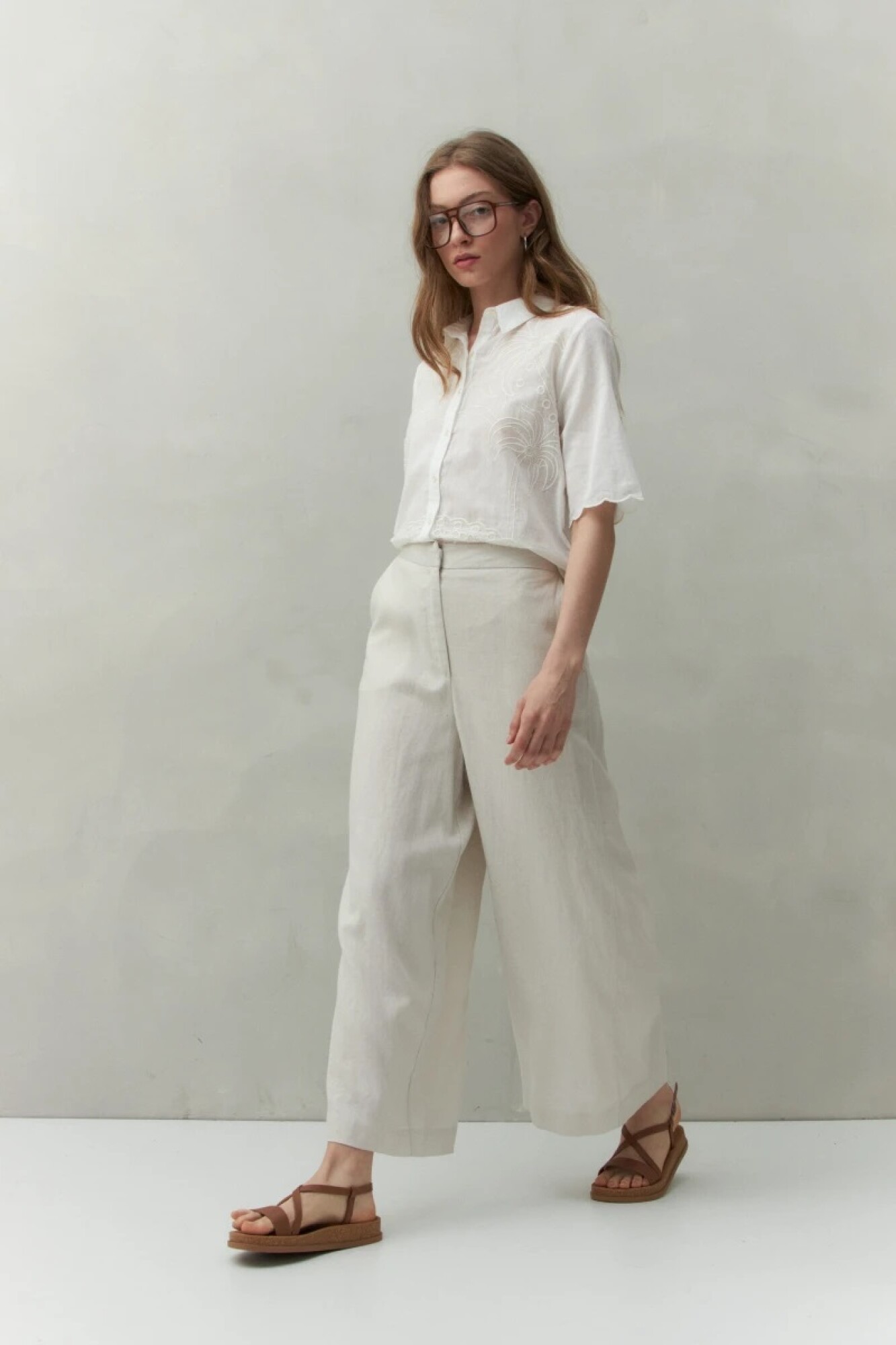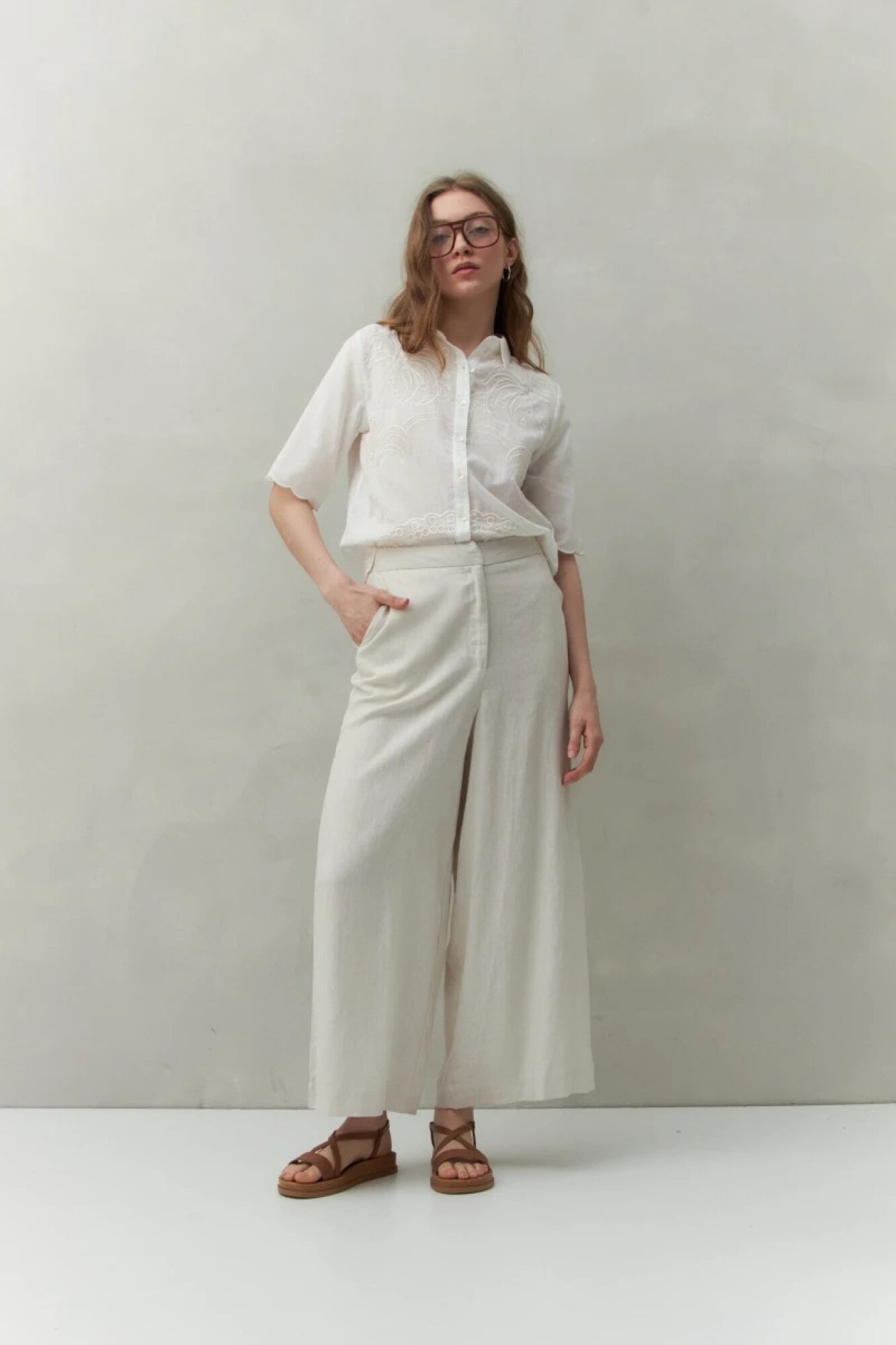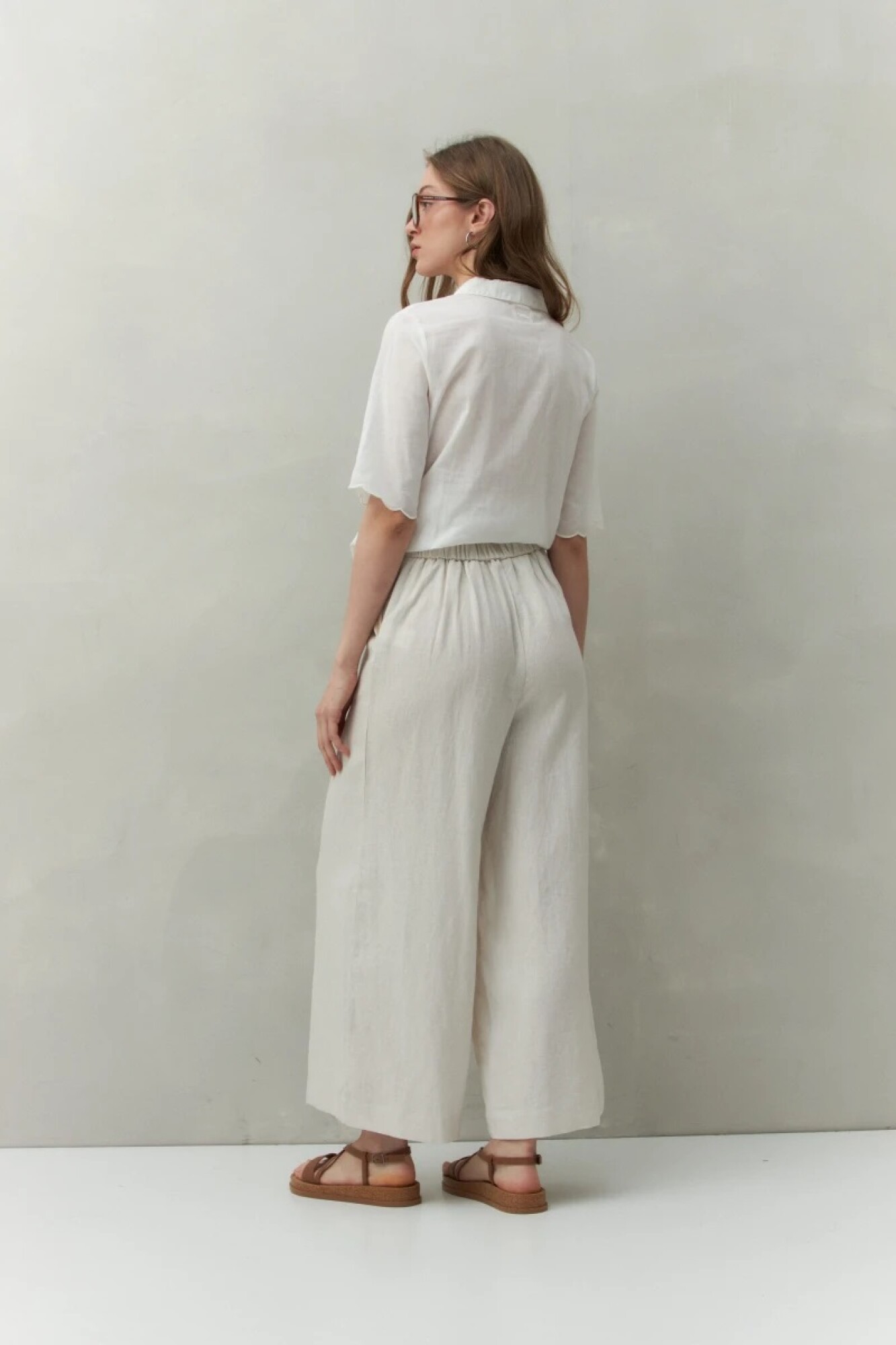 Pantalón de corte amplio confeccionado en mezcla de lino y viscosa, una combinación que aporta frescura, caída fluida y un tacto natural. Su diseño de cintura media con elástico en la espalda ofrece comodidad sin perder estilo. Ideal para looks relajados de verano o para elevar un outfit casual con camisas o tops ligeros.