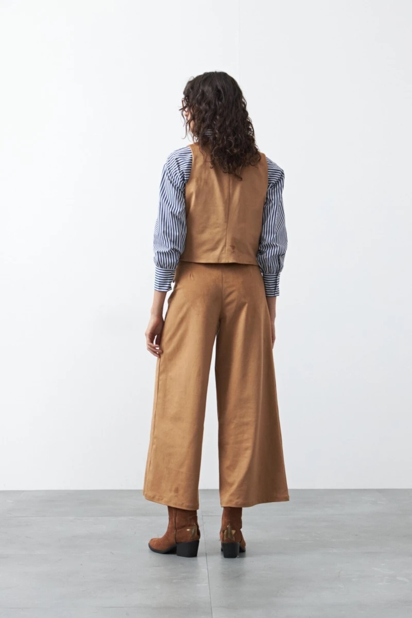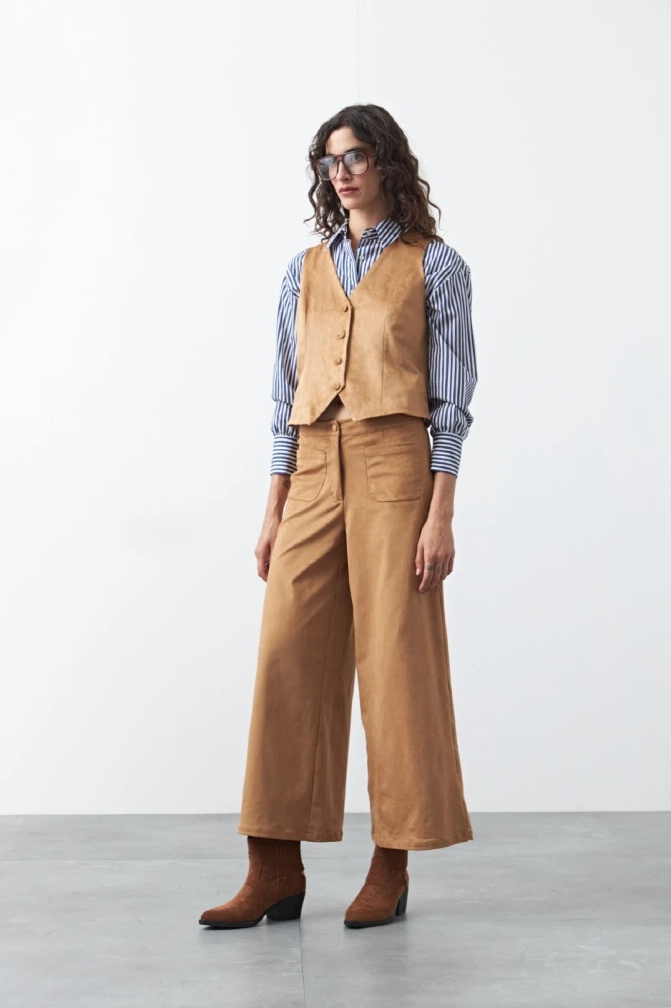 Pantalón ancho de gamuza, de calce relajado y caída suave, que aporta textura y un acabado visualmente sofisticado. Su silueta amplia estiliza y acompaña el movimiento, mientras que la gamuza suma un efecto aterciopelado que eleva el diseño y lo vuelve ideal tanto para looks urbanos como para propuestas más pulidas. Un básico con presencia, clave para elevar cualquier look.