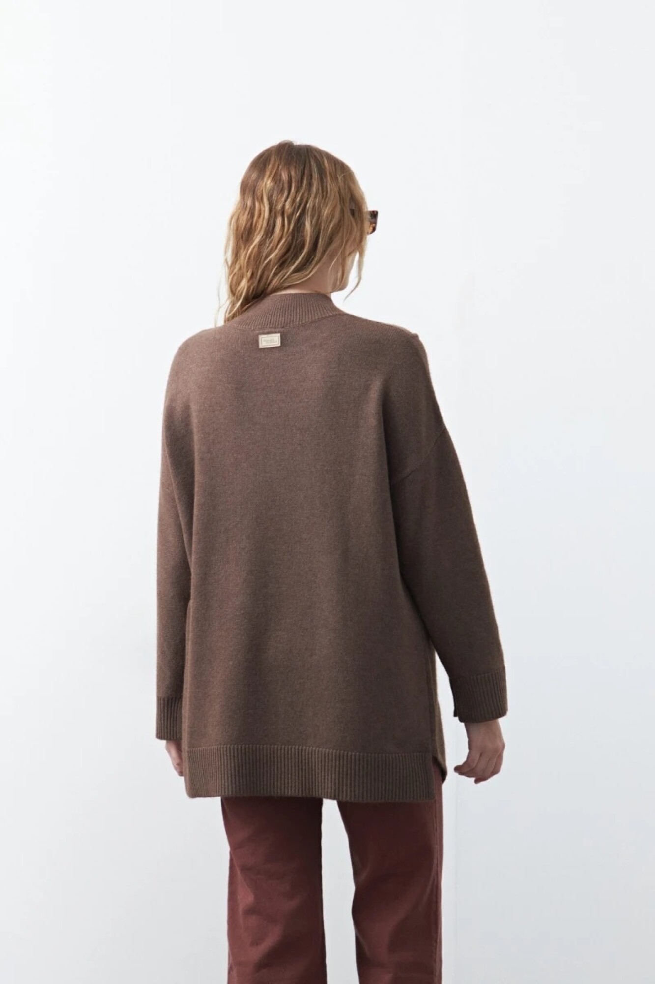 Polera oversized de tejido suave y diseño asimétrico. Con silueta amplia y hombros caídos que aportan una estética relajada y contemporánea. Su diseño incorpora una costura diagonal en el frente que genera un efecto visual original, acompañado por terminaciones acanaladas en cuello, puños y ruedo que equilibran la prenda.