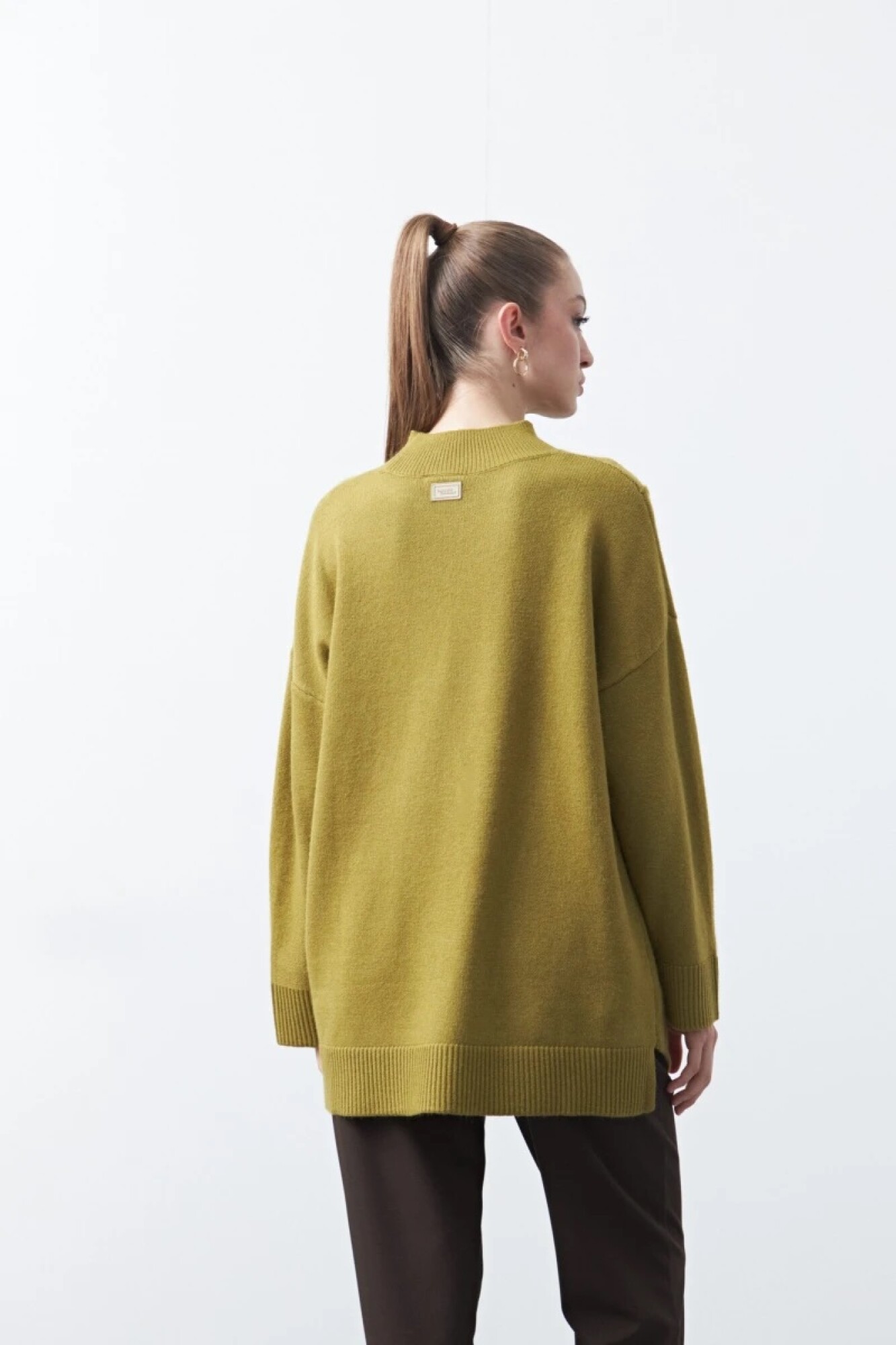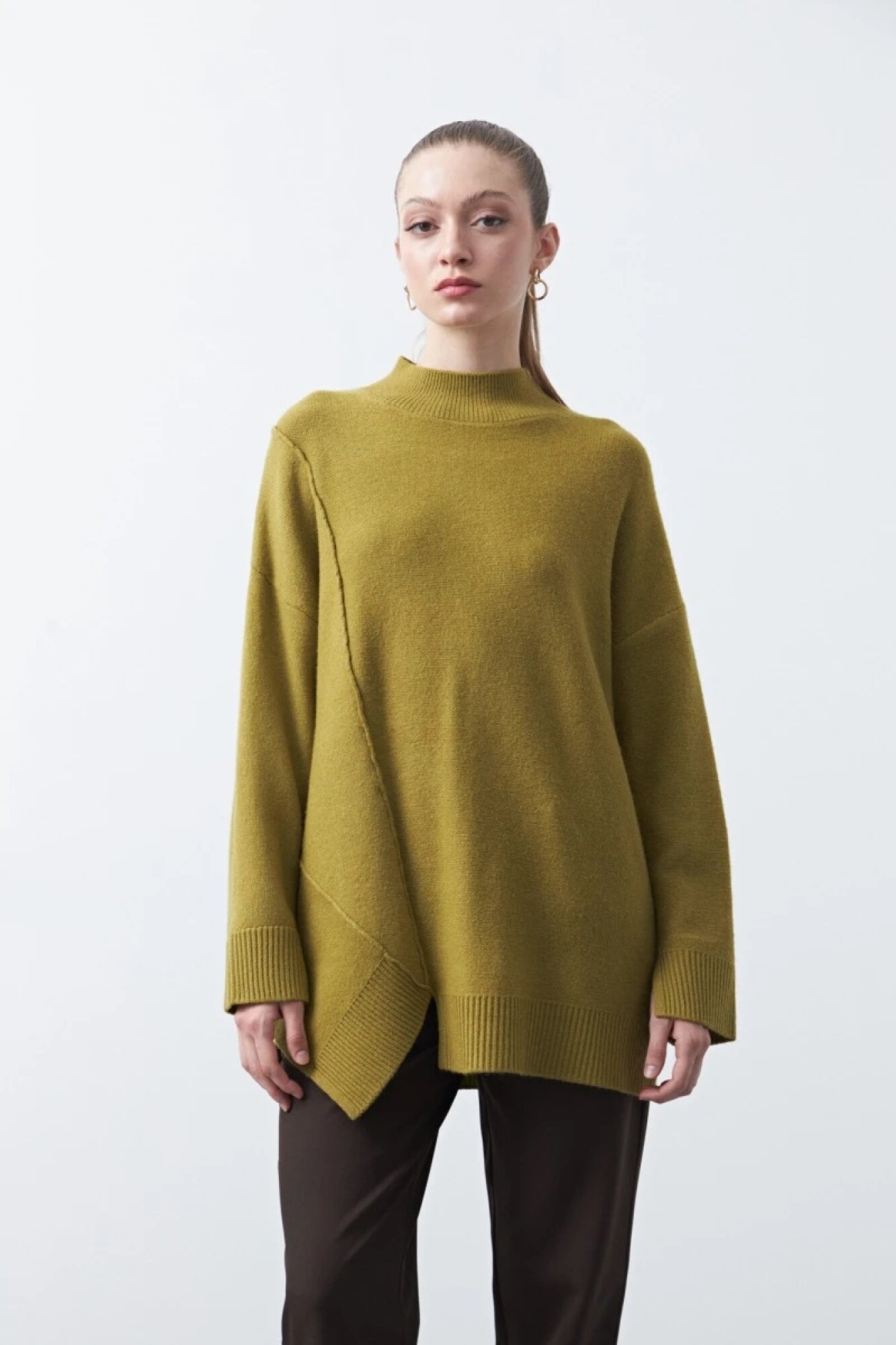 Polera oversized de tejido suave y diseño asimétrico. Con silueta amplia y hombros caídos que aportan una estética relajada y contemporánea. Su diseño incorpora una costura diagonal en el frente que genera un efecto visual original, acompañado por terminaciones acanaladas en cuello, puños y ruedo que equilibran la prenda.