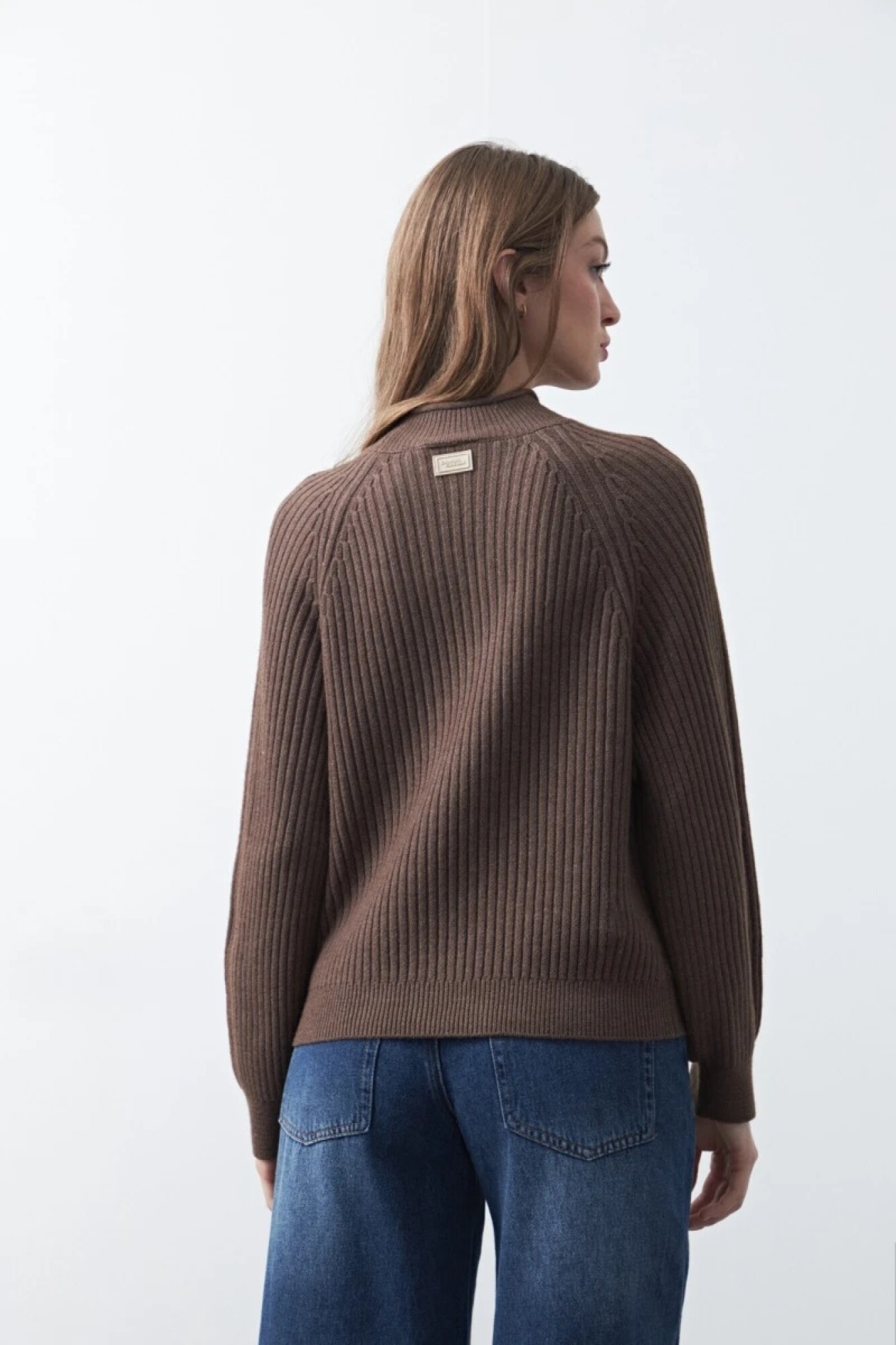 Polera tramada de manga larga, con tejido trabajado que combina trenzas y canales verticales, aportando textura y profundidad al diseño. Su cuello alto y las mangas raglán refuerzan una silueta cómoda y contemporánea, mientras que los puños y el ruedo acanalados brindan estructura al calce.