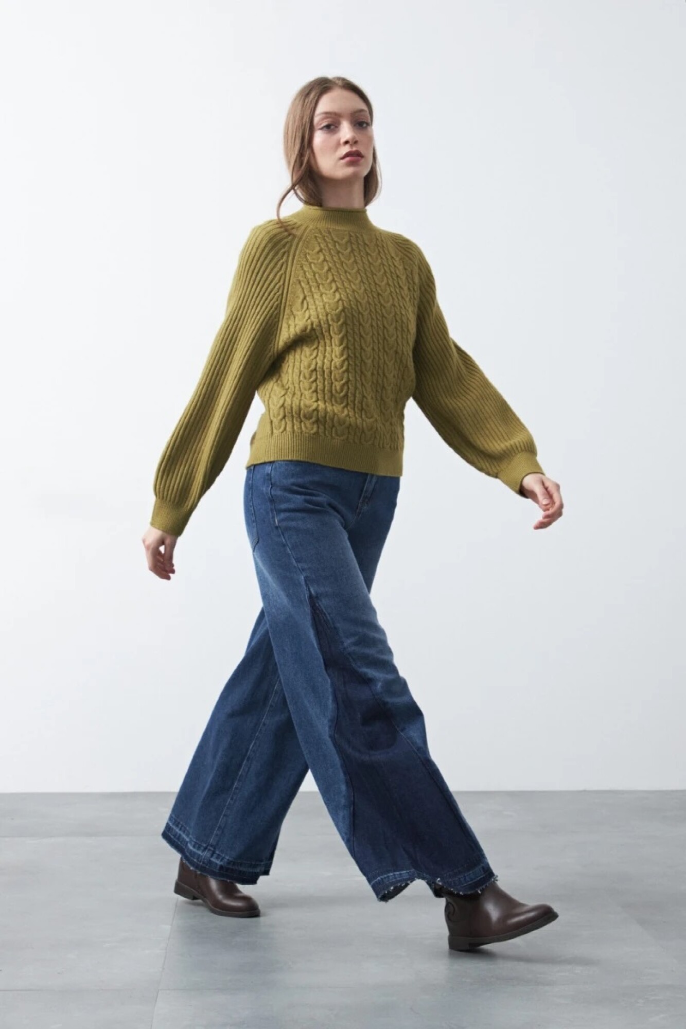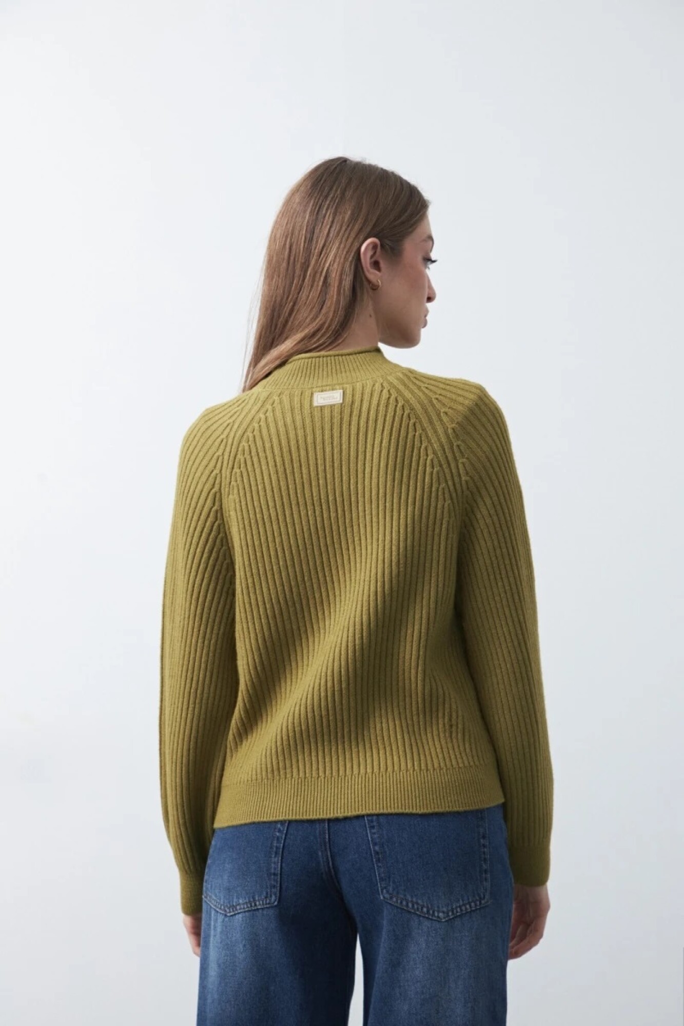 Polera tramada de manga larga, con tejido trabajado que combina trenzas y canales verticales, aportando textura y profundidad al diseño. Su cuello alto y las mangas raglán refuerzan una silueta cómoda y contemporánea, mientras que los puños y el ruedo acanalados brindan estructura al calce.