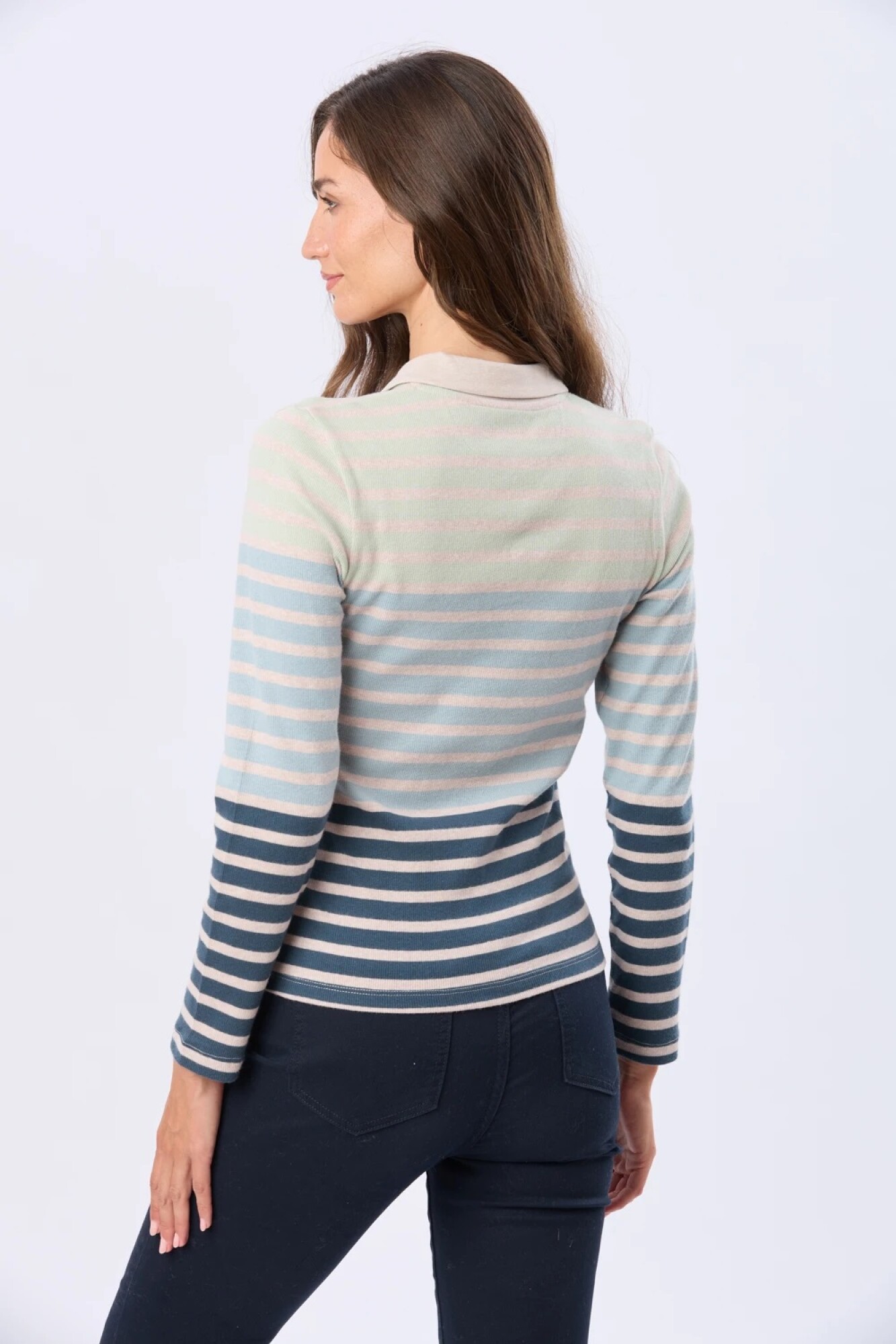$ 1.320 Remera polo rayada en rib de algodón con cuello liso sin botones y diseño de rayas en degradé.
