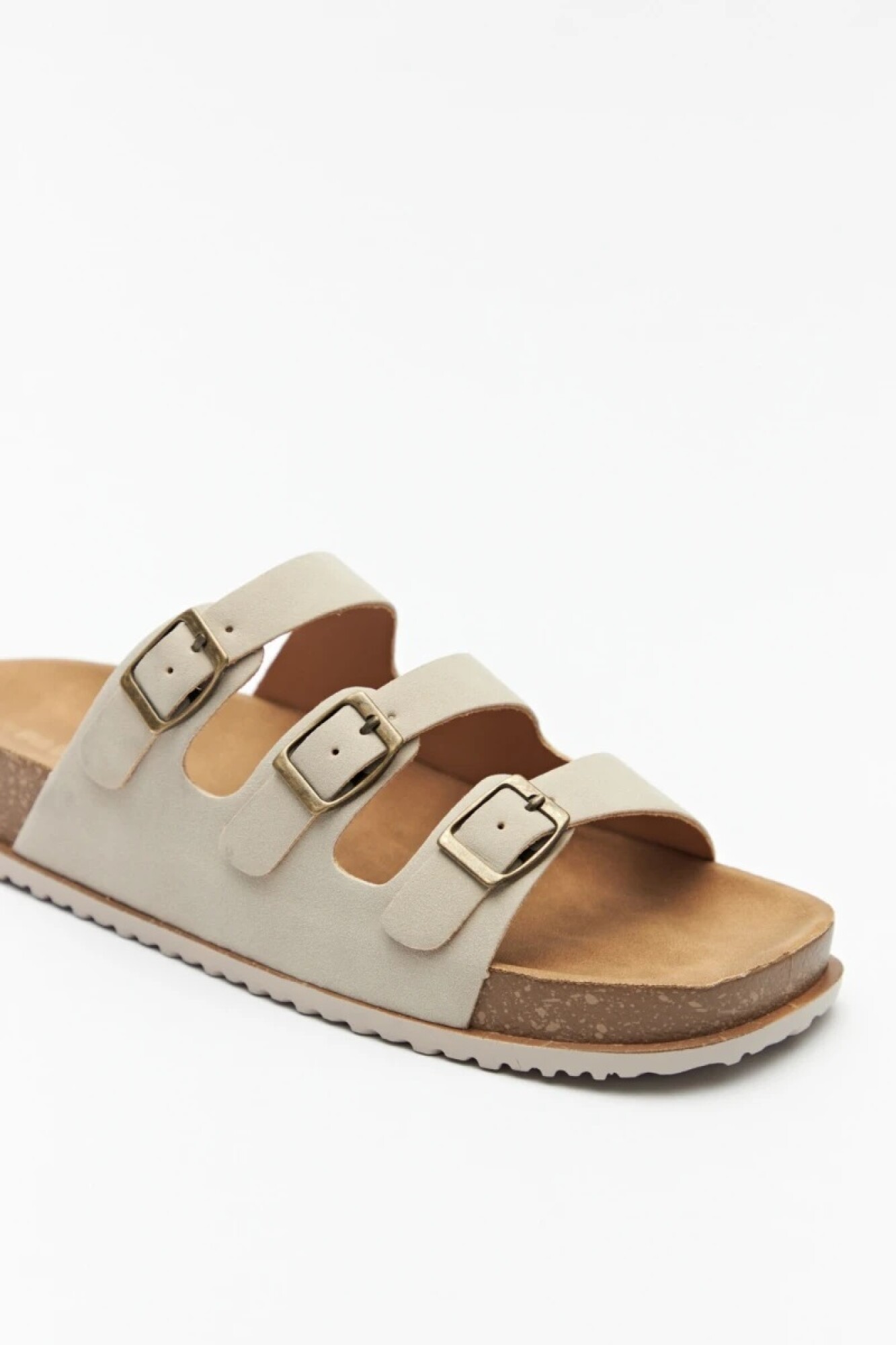 $ 792 Sandalias con base de corcho y triple tira ajustable de gamuza y hebillas metálicas.
