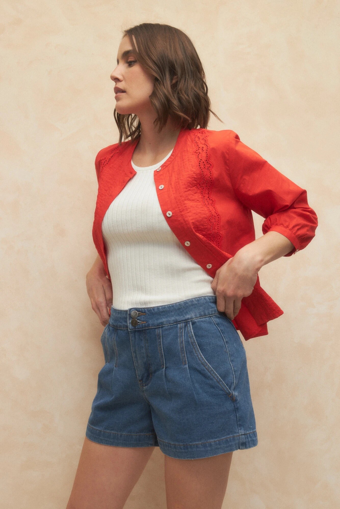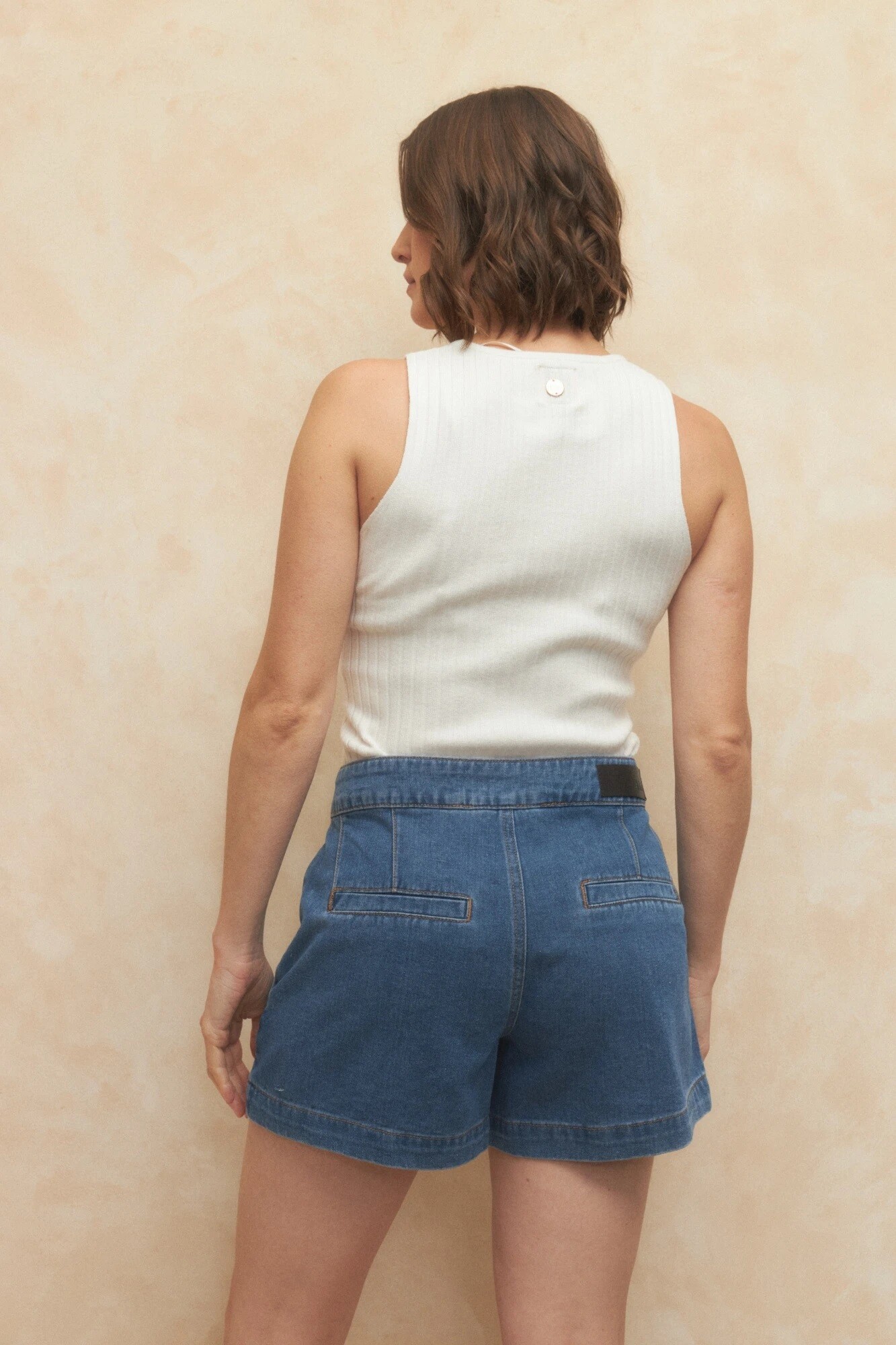 $ 1.192 Short de jean pinzado con doble botón en pretina.