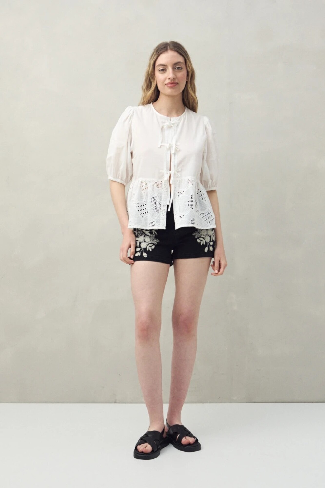 Short de denim con bordado floral inspirado en el estilo boho, que aporta un aire artesanal y veraniego al look. Con bolsillos funcionales, bajo con pequeña abertura lateral y calce cómodo gracias a su textura elástica, es una prenda ideal para combinar con blusas livianas o tops tejidos.