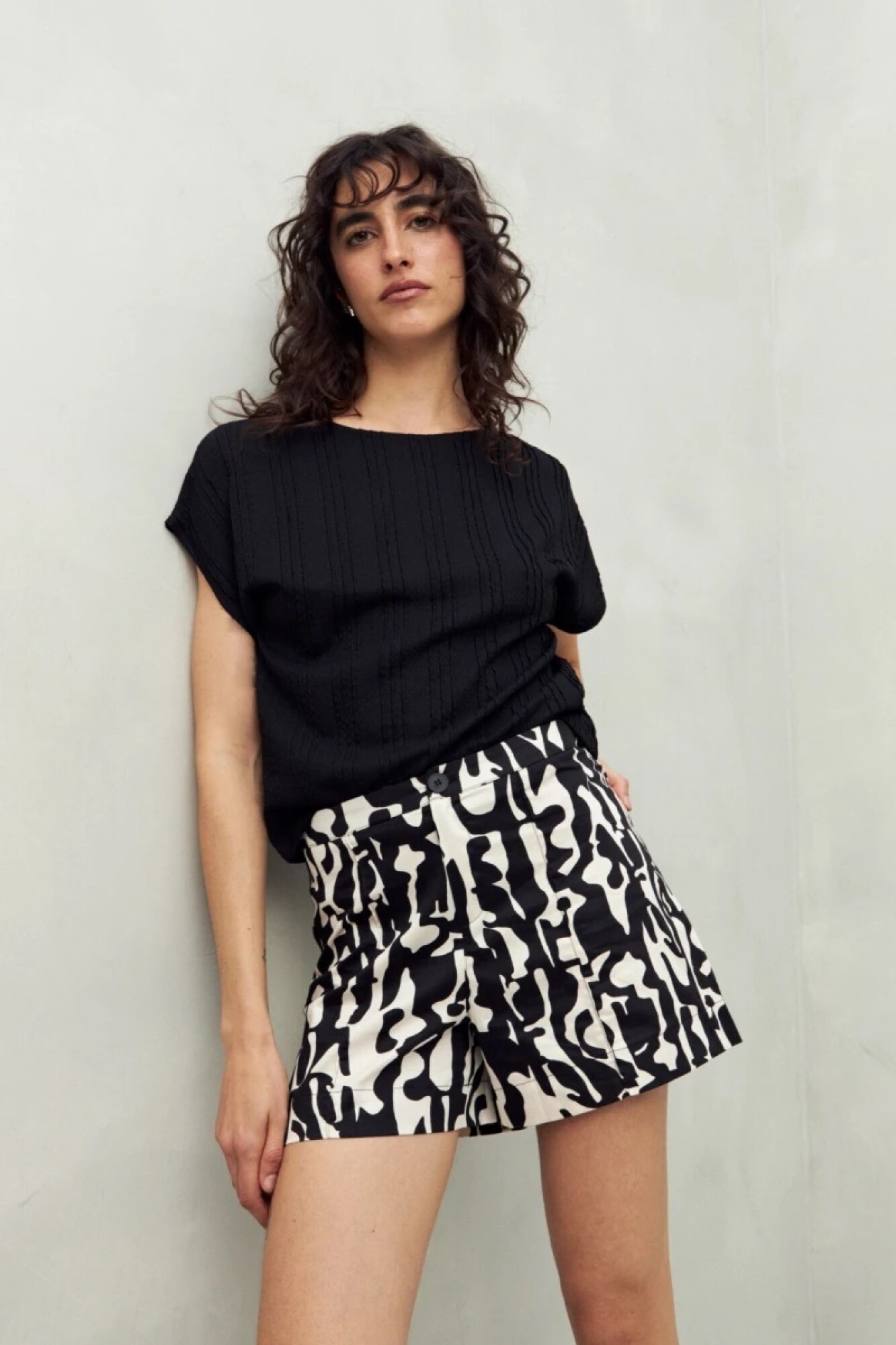 $ 952 Short de algodón con estampas protagonistas que reinventan un básico de verano. Su silueta recta y estructura liviana aportan comodidad y estilo, ideal para armar looks urbanos con personalidad.