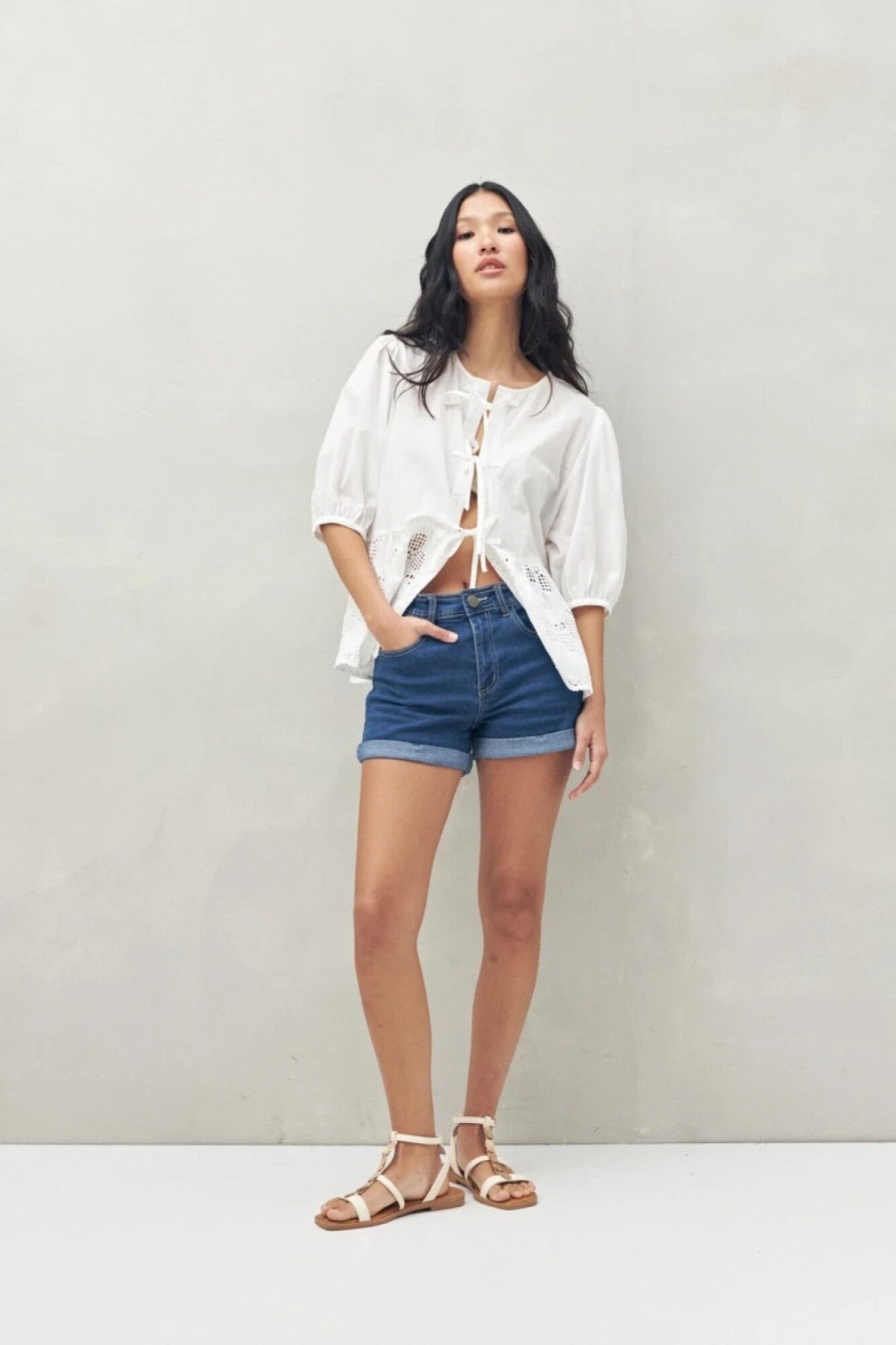 Short de denim con dobladillo fijo y bolsillos delanteros y traseros que suman practicidad al diseño. Confeccionado en un textil con caída ligera y un toque de elasticidad, combina comodidad y estilo. Ideal para looks relajados de verano, ya sea con tops tejidos, camisas livianas o remeras básicas.