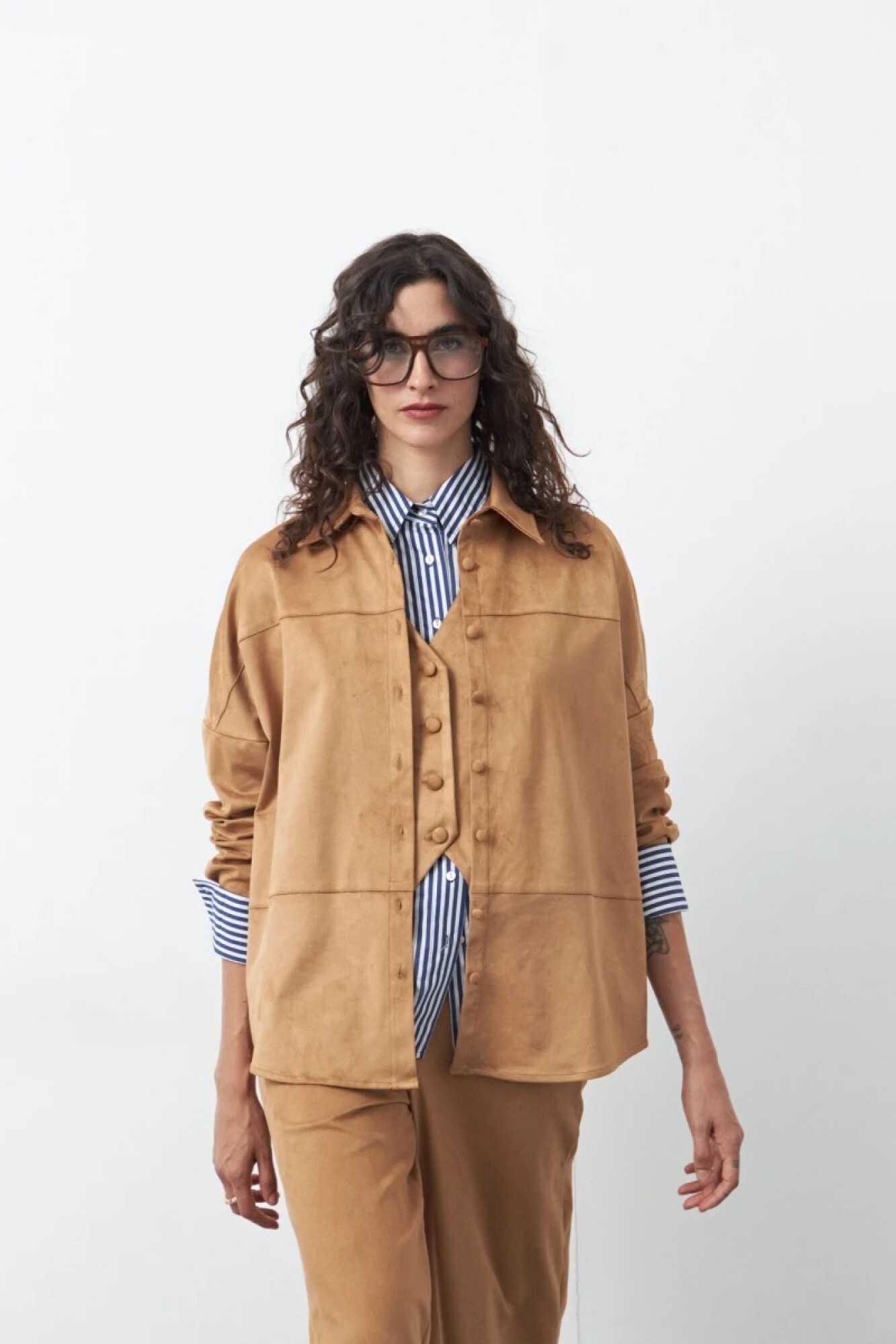 Sobrecamisa de gamuza de silueta relajada, pensada para sumar textura y profundidad a los looks. Su acabado tipo gamuza aporta un efecto visual sofisticado y suave, mientras que la estructura liviana permite usarla como prenda de transición entre estaciones. El diseño combina líneas limpias con un calce cómodo, ideal para llevar abierta o cerrada según el styling, logrando un equilibrio entre elegancia y funcionalidad. Una pieza versátil, clave para elevar cualquier look con un aire moderno.