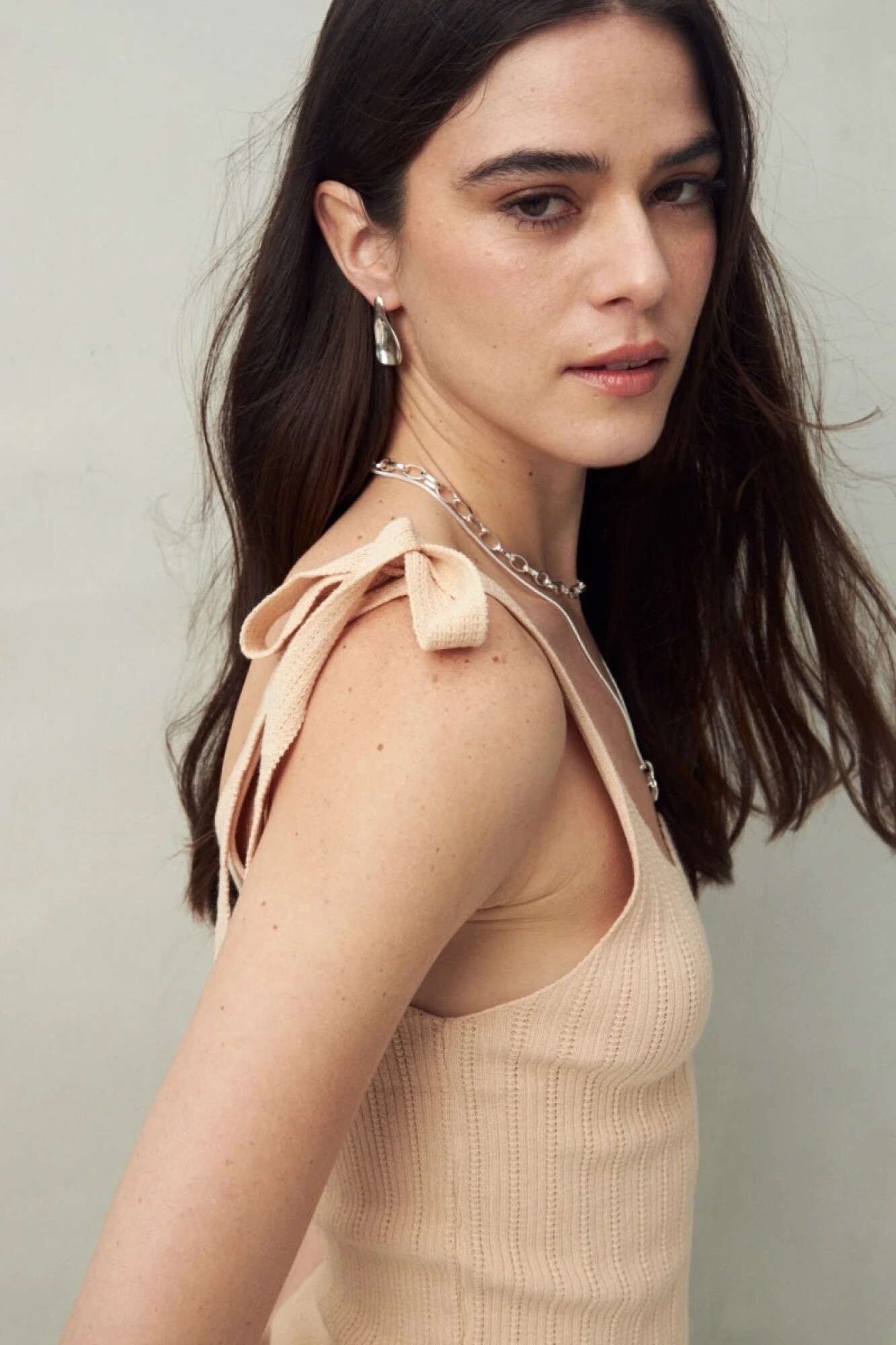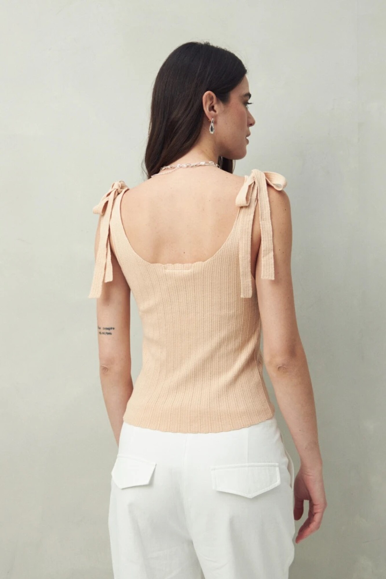 Top tejido con tiras para anudar en los hombros, pensado para resaltar el detalle femenino y delicado de su diseño tramado. Su silueta ajustada estiliza la figura, mientras que la textura acanalada le da un aire moderno y versátil para llevar tanto de día como de noche.
