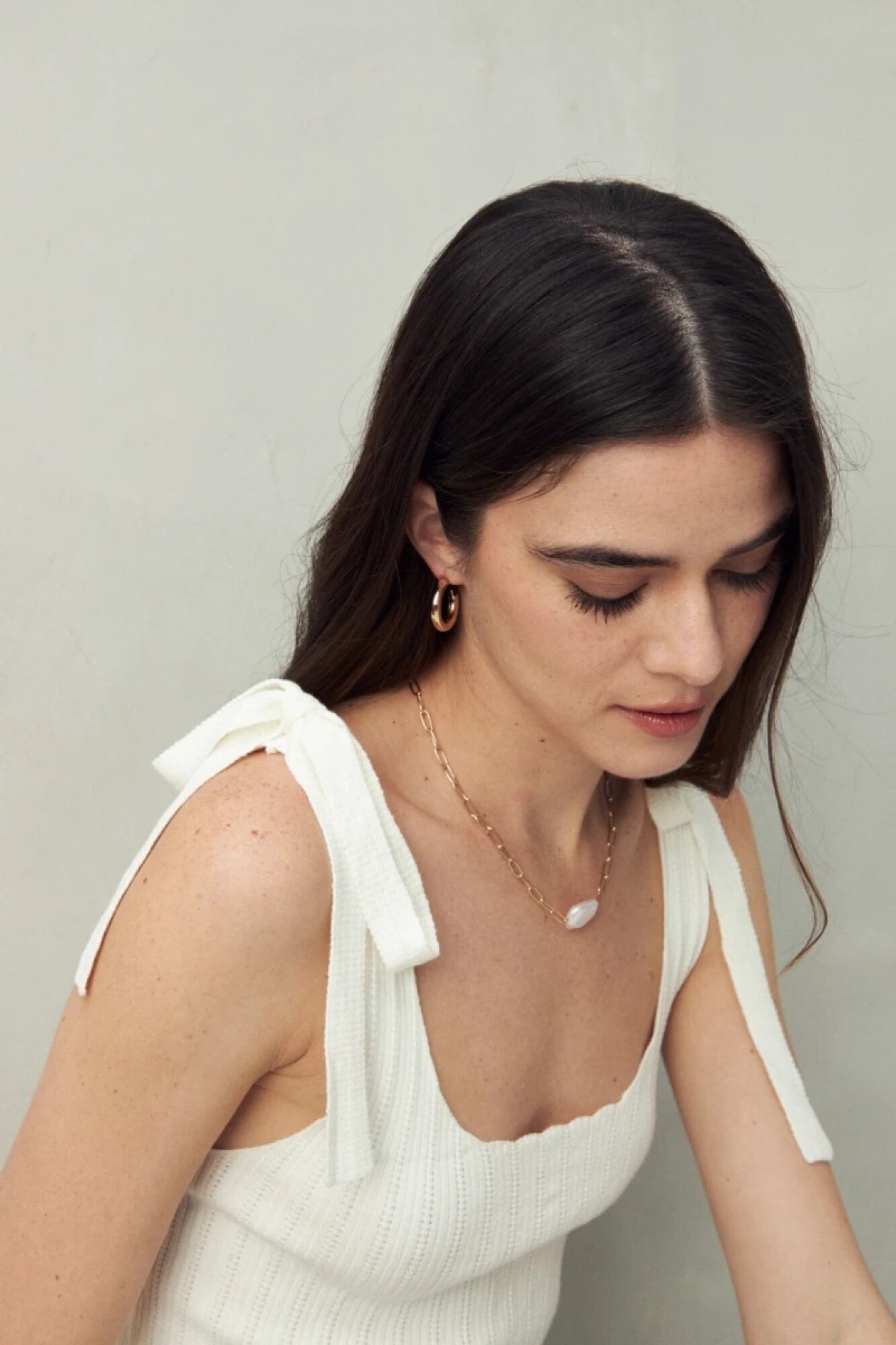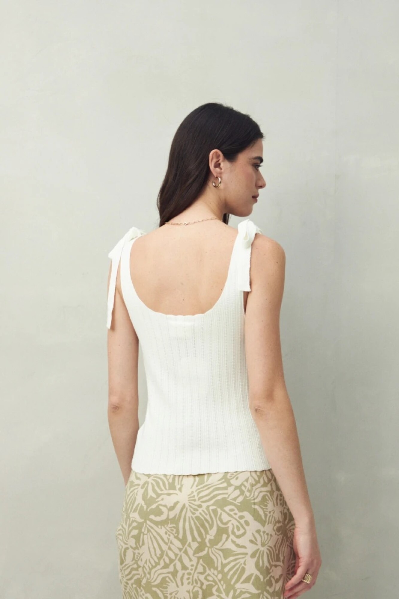 Top tejido con tiras para anudar en los hombros, pensado para resaltar el detalle femenino y delicado de su diseño tramado. Su silueta ajustada estiliza la figura, mientras que la textura acanalada le da un aire moderno y versátil para llevar tanto de día como de noche.