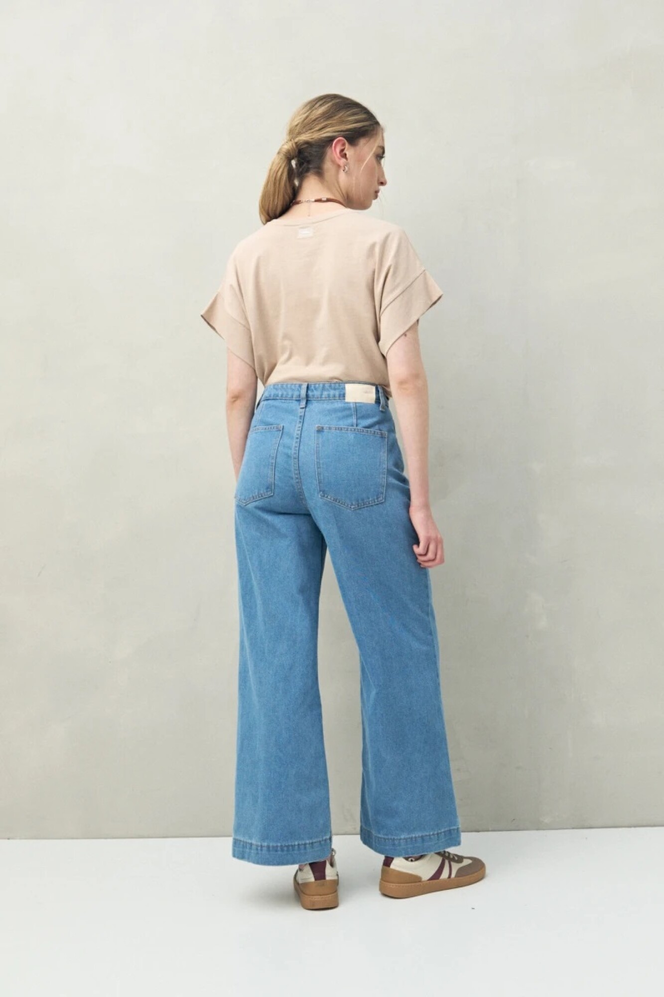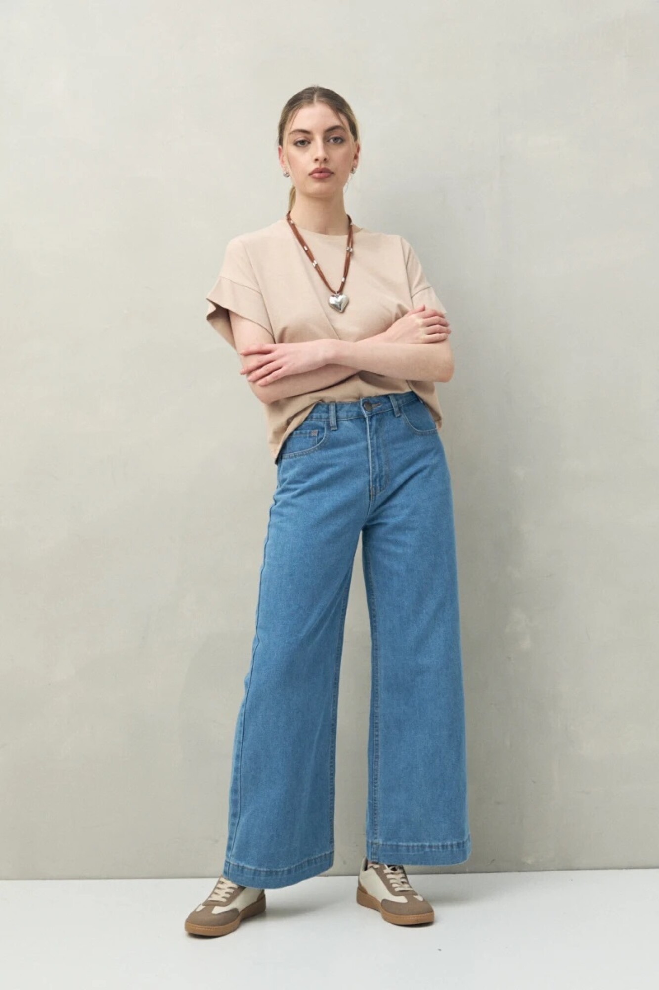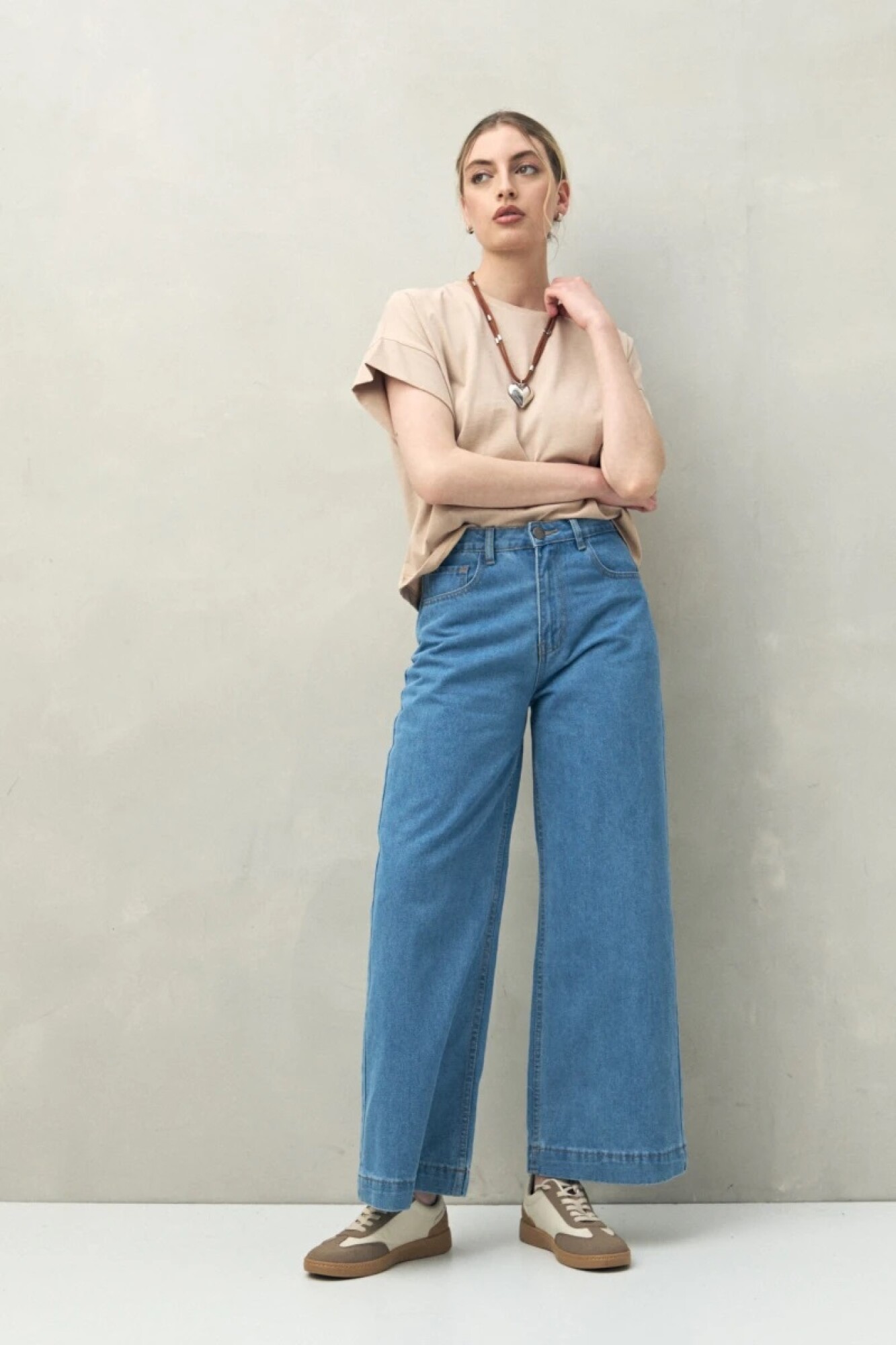 Este jean ancho es la definición de comodidad con estilo. De tiro alto y silueta fluida, su fit amplio aporta un aire relajado y trendy que realza cualquier look. El tejido combina resistencia y suavidad, logrando una caída natural que estiliza y suma movimiento. Perfecto para llevar con tops ajustados o camisas sueltas, es un comodín versátil para looks urbanos y modernos.