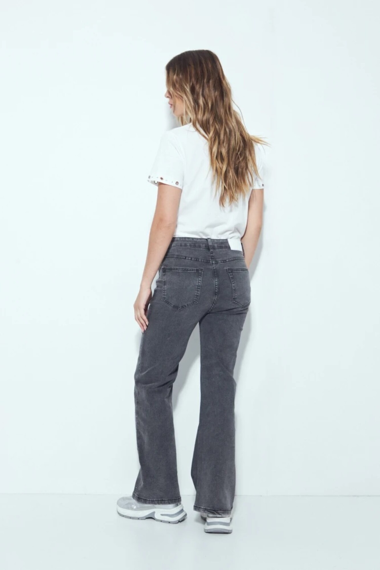 Pantalón de denim de fit straight, con pierna recta desde la cadera hasta el ruedo que estiliza la silueta y aporta un calce clásico actualizado. Presenta aplicaciones de strass en la pierna, integradas de manera sutil al diseño para aportar un acabado diferencial sin perder sobriedad. Un ítem en tendencia, fácil de combinar y clave para elevar cualquier look.
