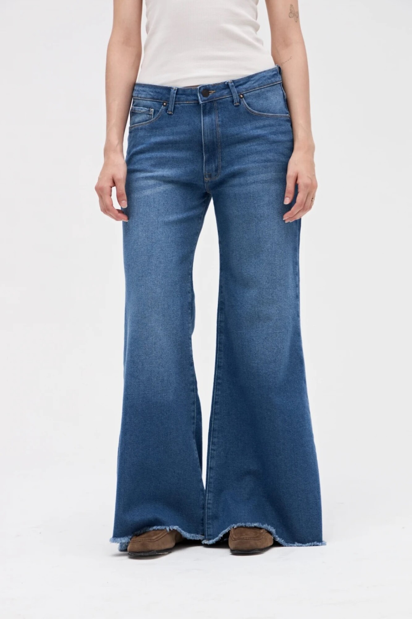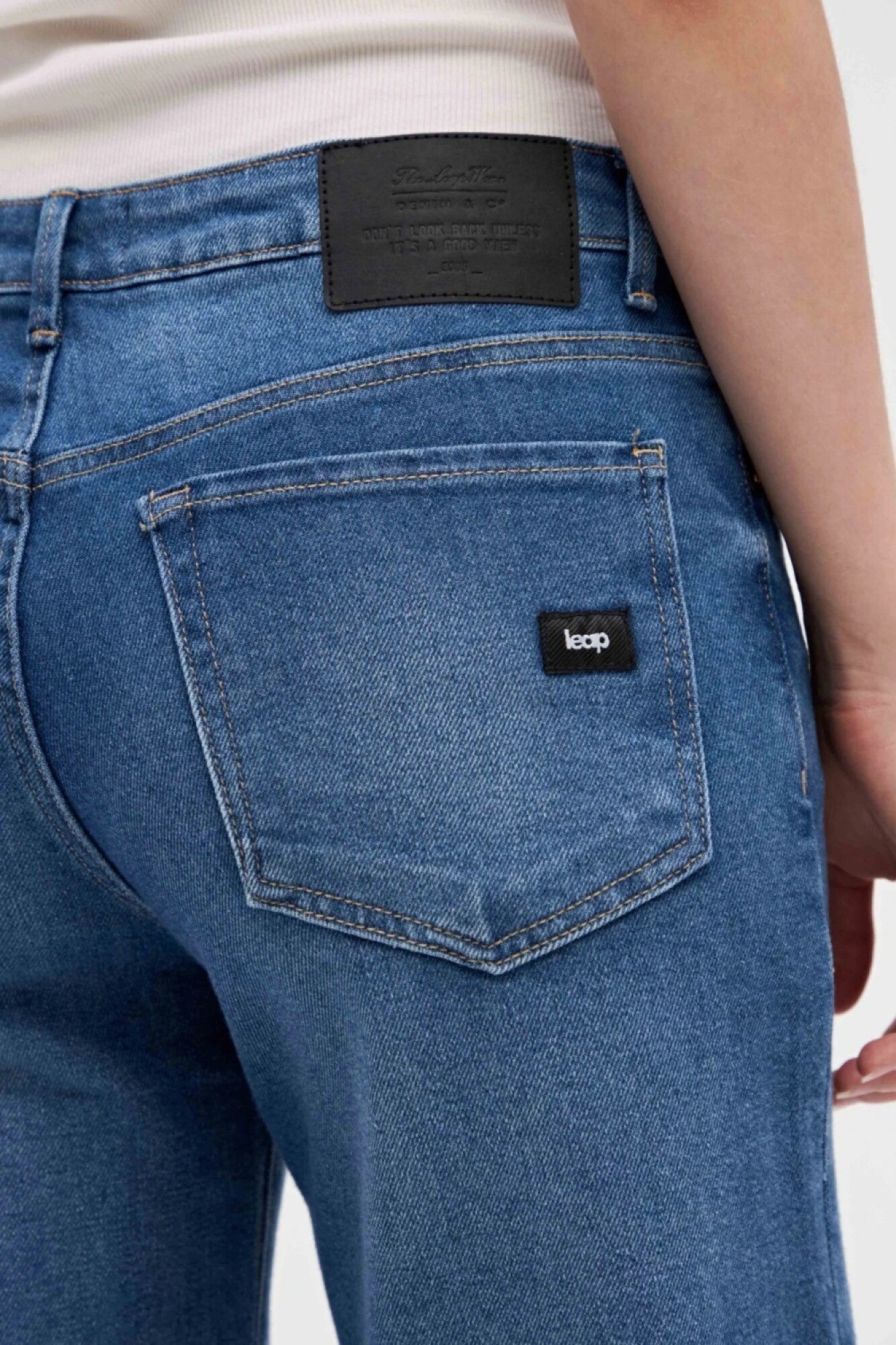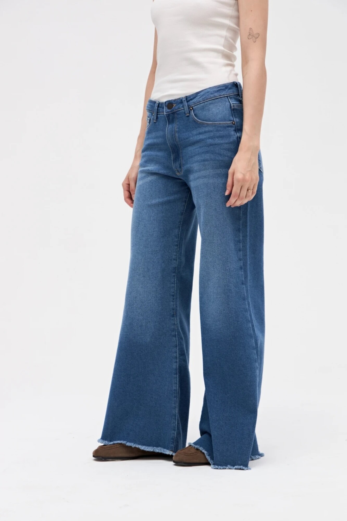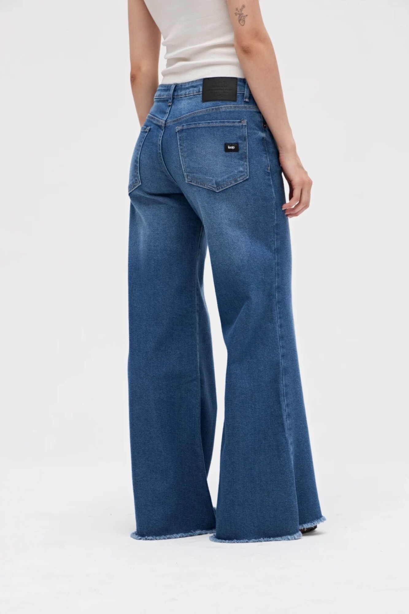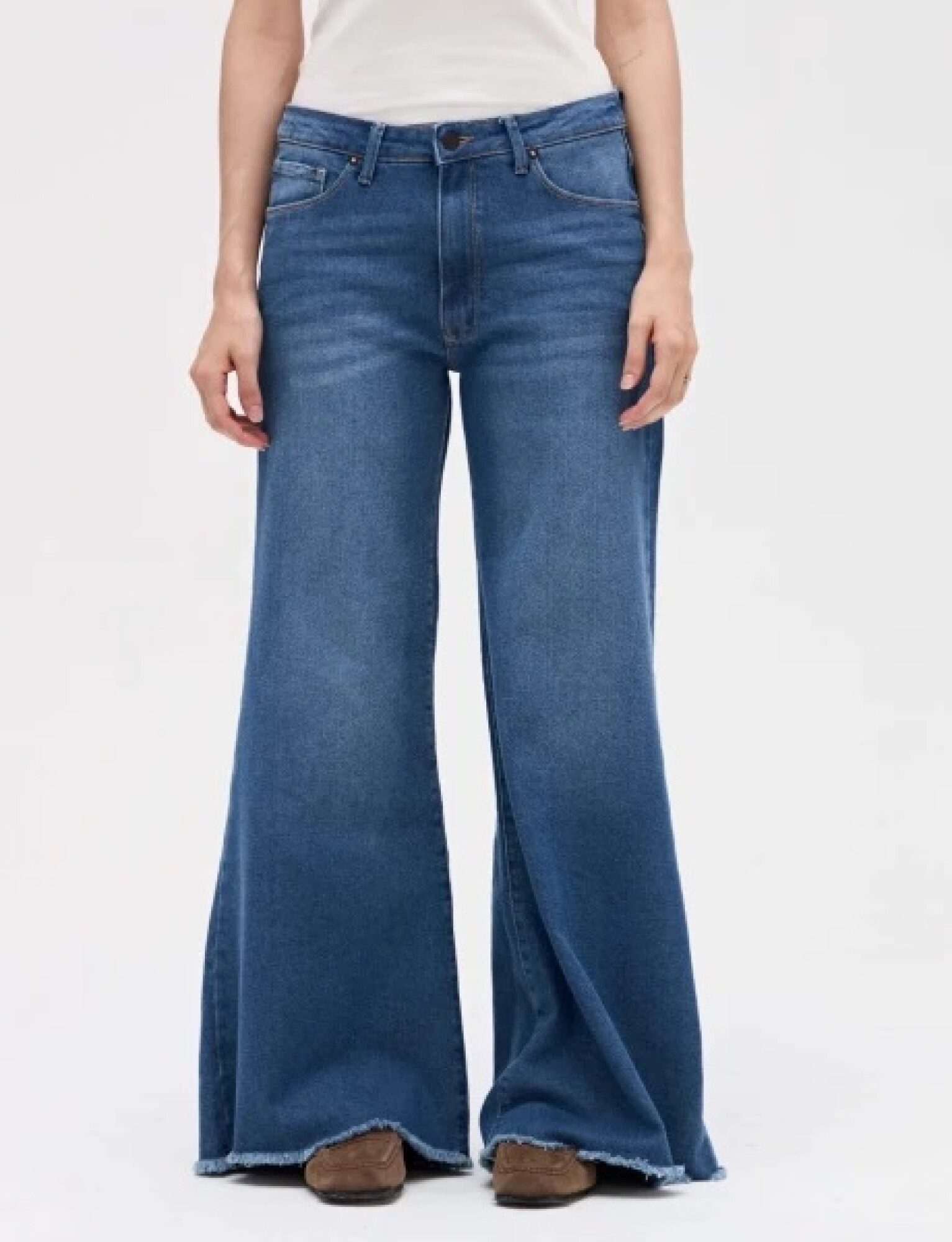 $ 2.472 Jean con corte holgado, leve ajustado en cintura y cadera con pierna levemente ancha.