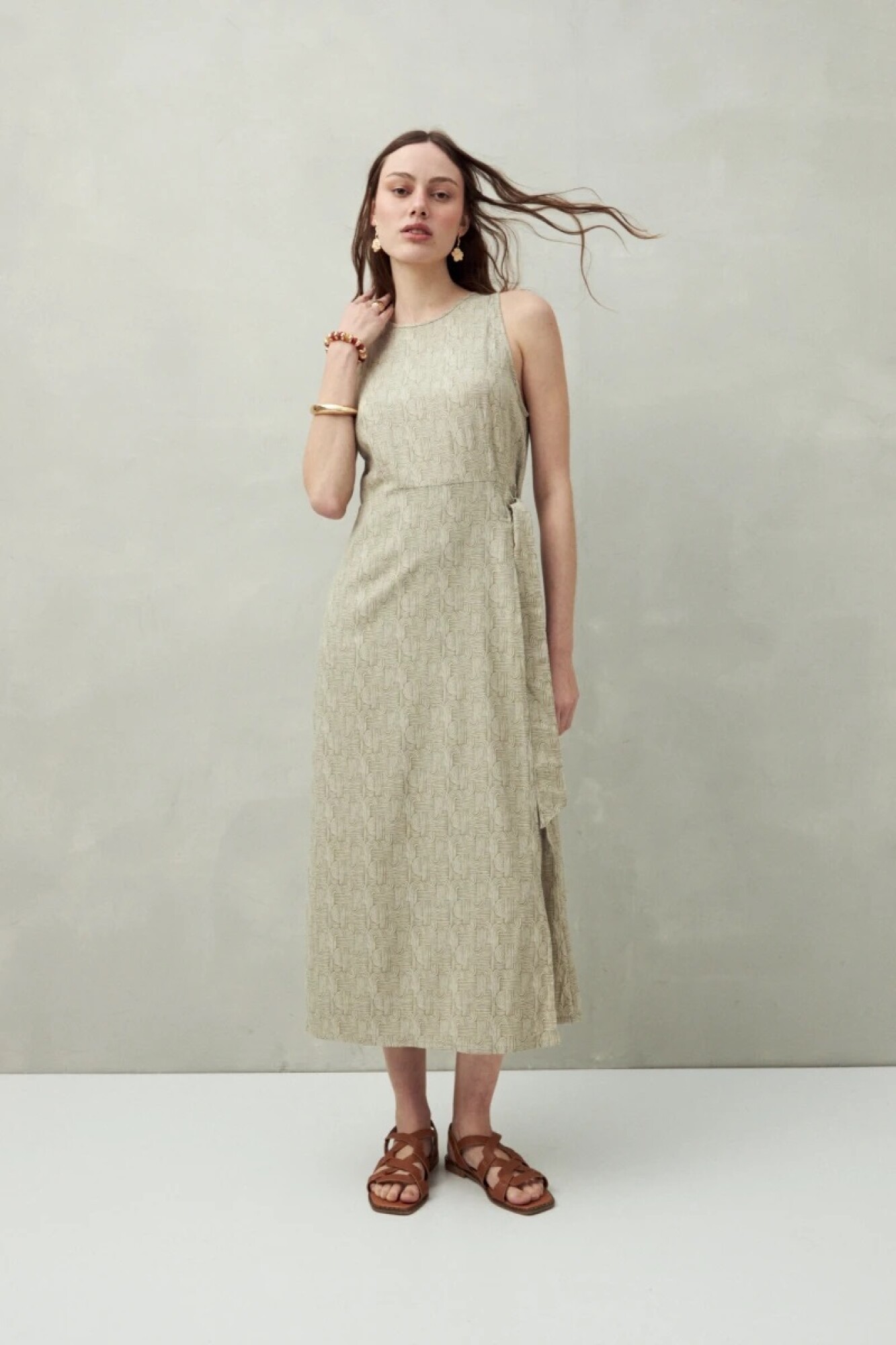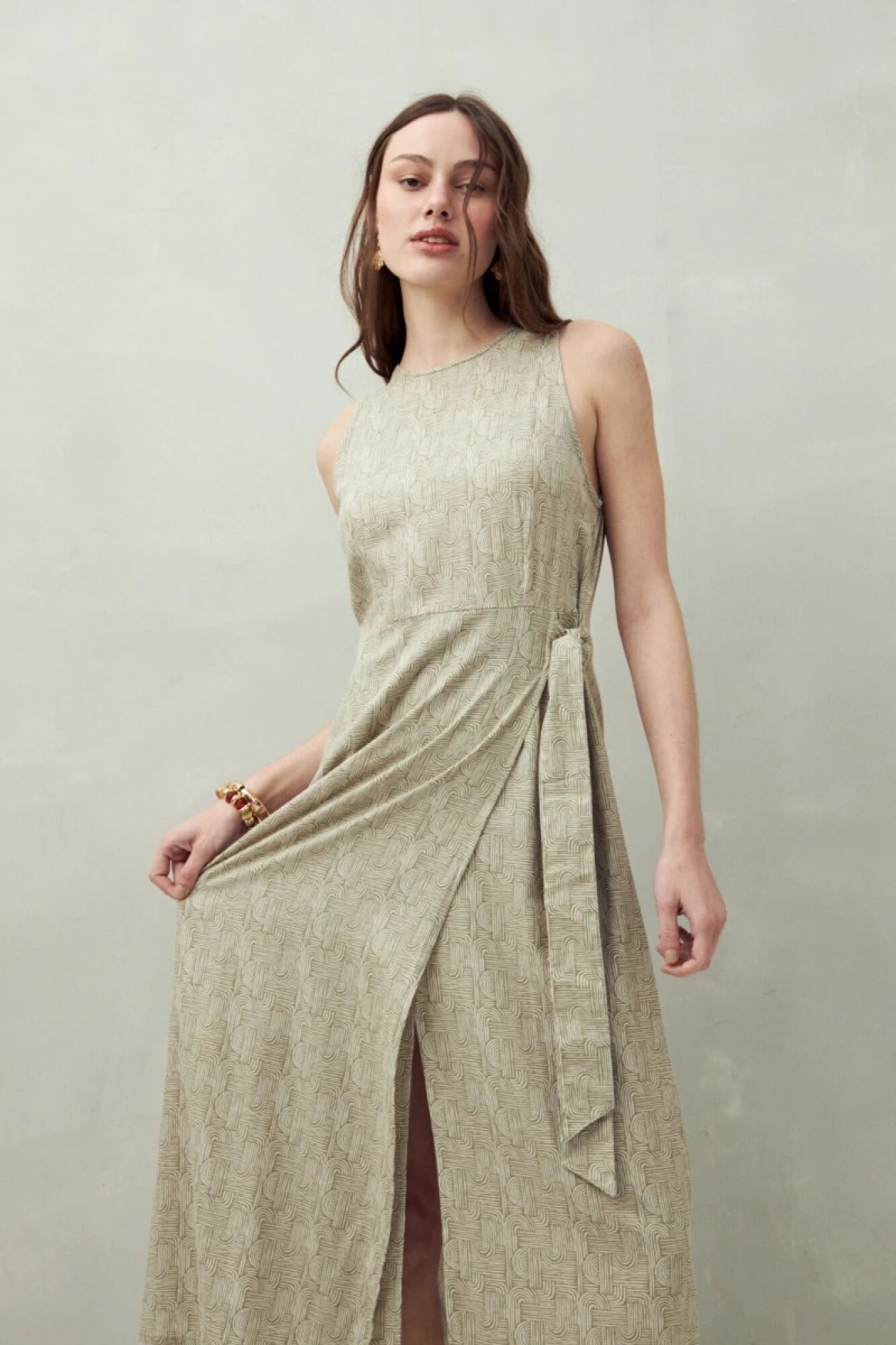 Vestido largo sin mangas con lazo lateral y estampa sutil, ideal para un look natural y elegante. Su confección en mezcla de lino y viscosa aporta una textura liviana con excelente caída, perfecta para los días de verano. El diseño con cruce y abertura frontal suma movimiento y un aire fresco que lo convierte en una pieza clave para outfits relajados o de ocasión.