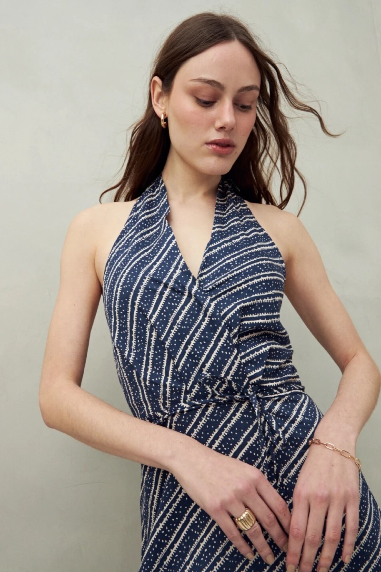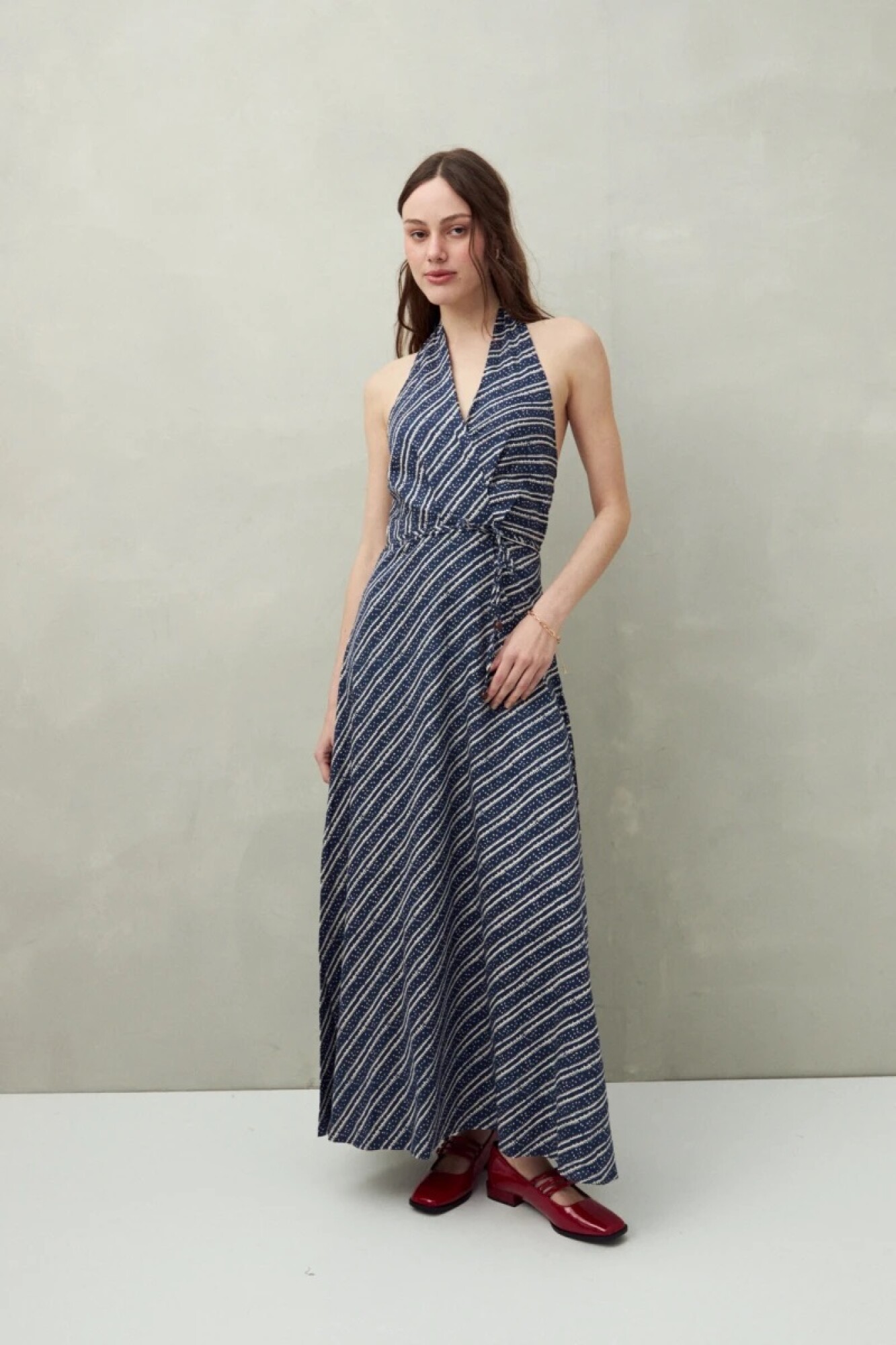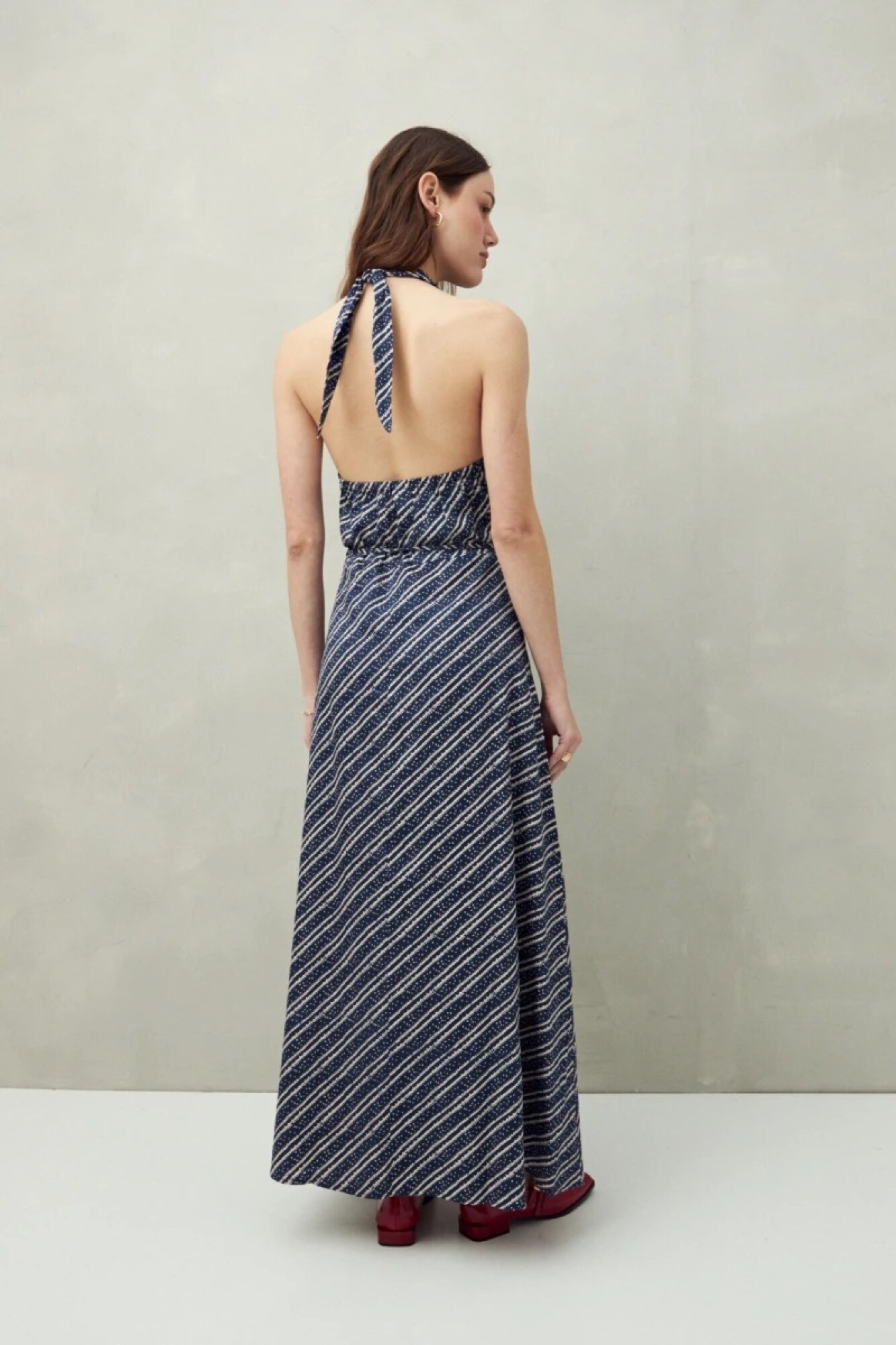 Vestido largo confeccionado en algodón liviano, con escote halter y lazo que se anuda al cuello. Su silueta fluida y cintura ajustable realzan la figura, evocando el encanto de los vestidos veraniegos de los años 50. Un diseño atemporal que equilibra frescura y elegancia.