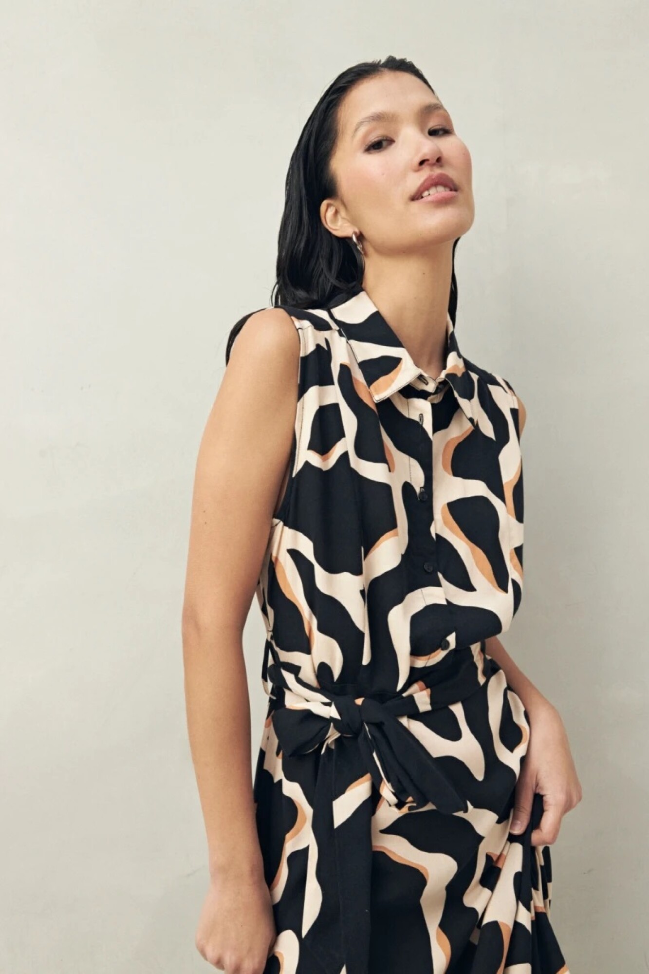 $ 1.352 Vestido largo sin mangas confeccionado en viscosa fluida, con cuello camisero y lazo para ajustar en la cintura. Su silueta liviana y femenina lo convierte en una opción versátil para días de calor o eventos casuales, con un aire relajado pero pulido.